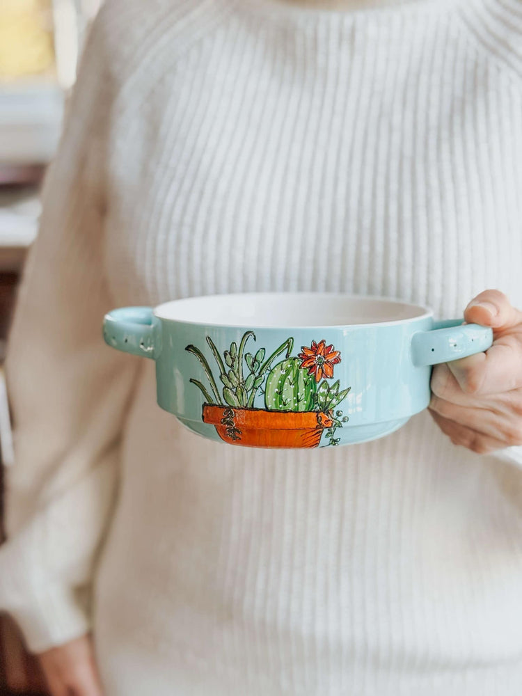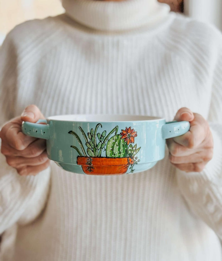 Idée cadeau: bol turquoise lustré avec 2 anses, design plantes succulentes peintes à la main par Pero