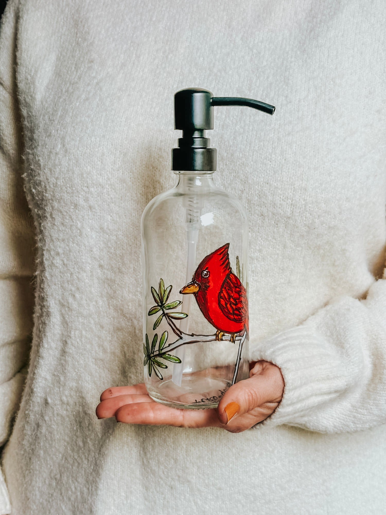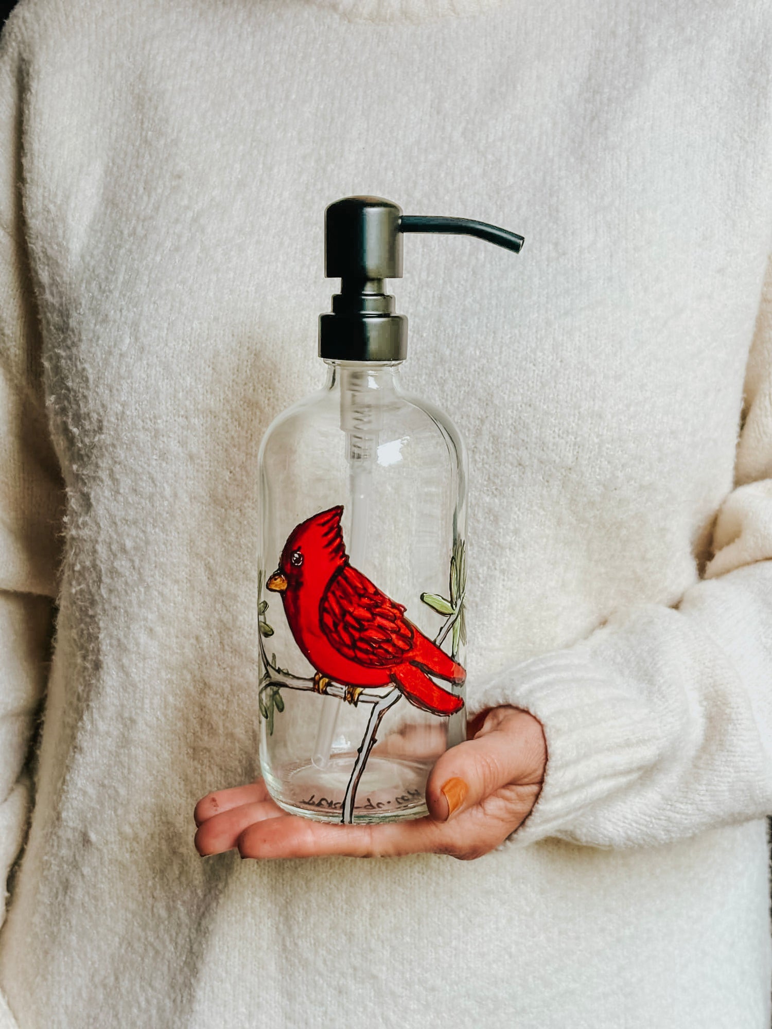 Bring a splash of cardinal charm to your countertop with this whimsical 425 ml glass soap dispenser! Featuring a hand-painted red bird design, it's the perfect companion for your kitchen or bathroom. Crafted from durable glass and recycled plastic, this versatile dispenser works beautifully with liquid soap, dish soap, or hand cream. The blank back panel is yours to personalize—add a name, date, or sweet message to make it uniquely yours. A delightful way to add personality to your daily routine!