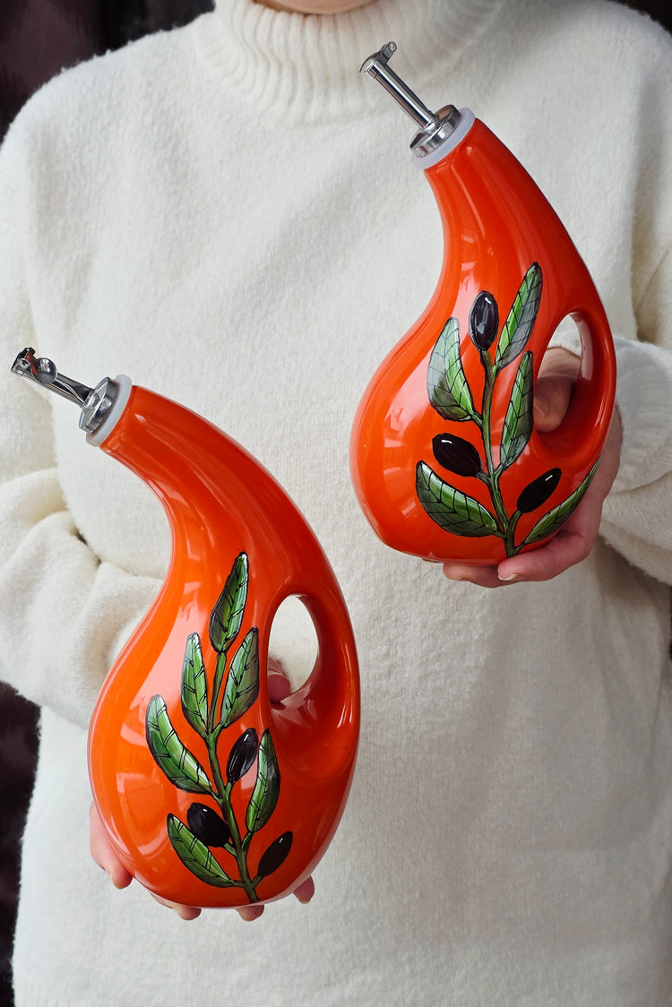 La bouteille en grès orange, peinte à la main avec un design d'olives kalamata.