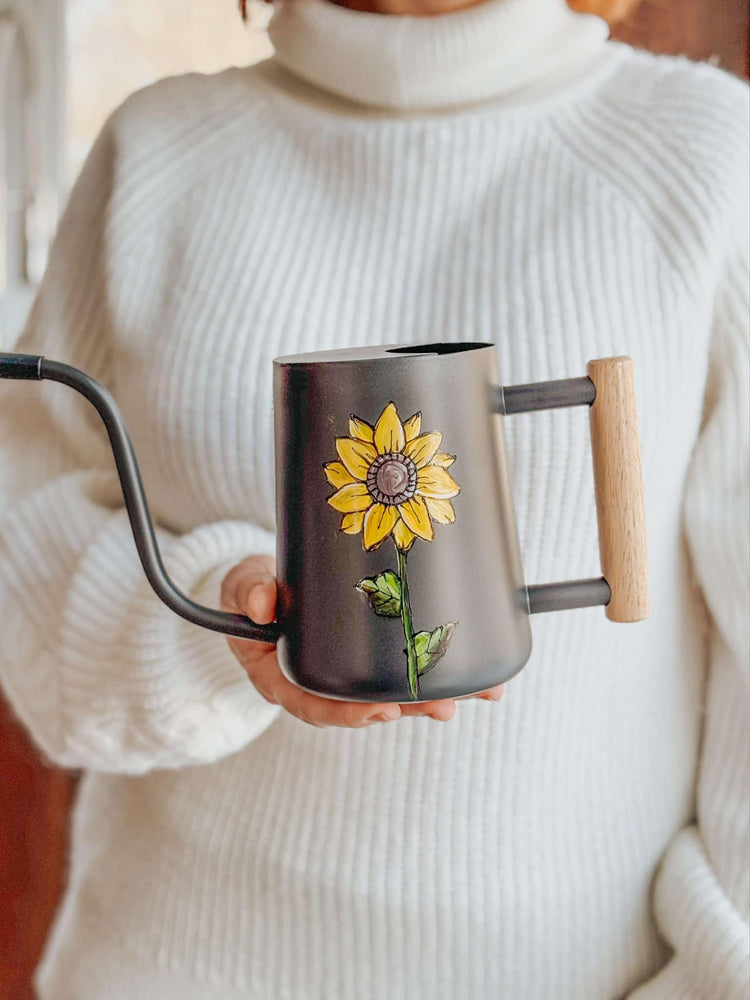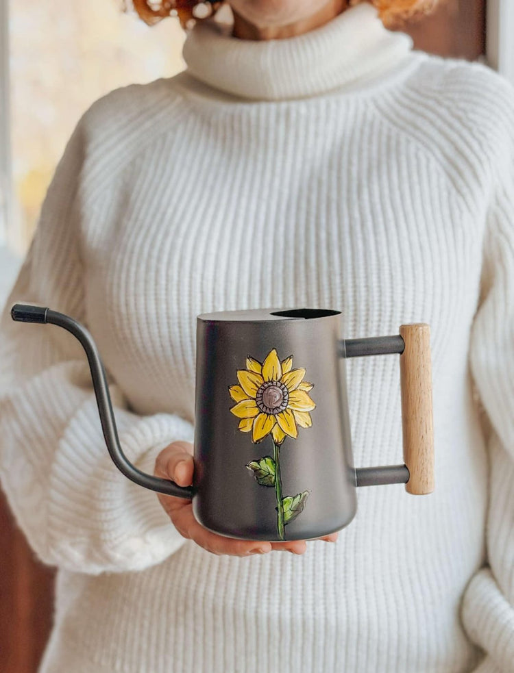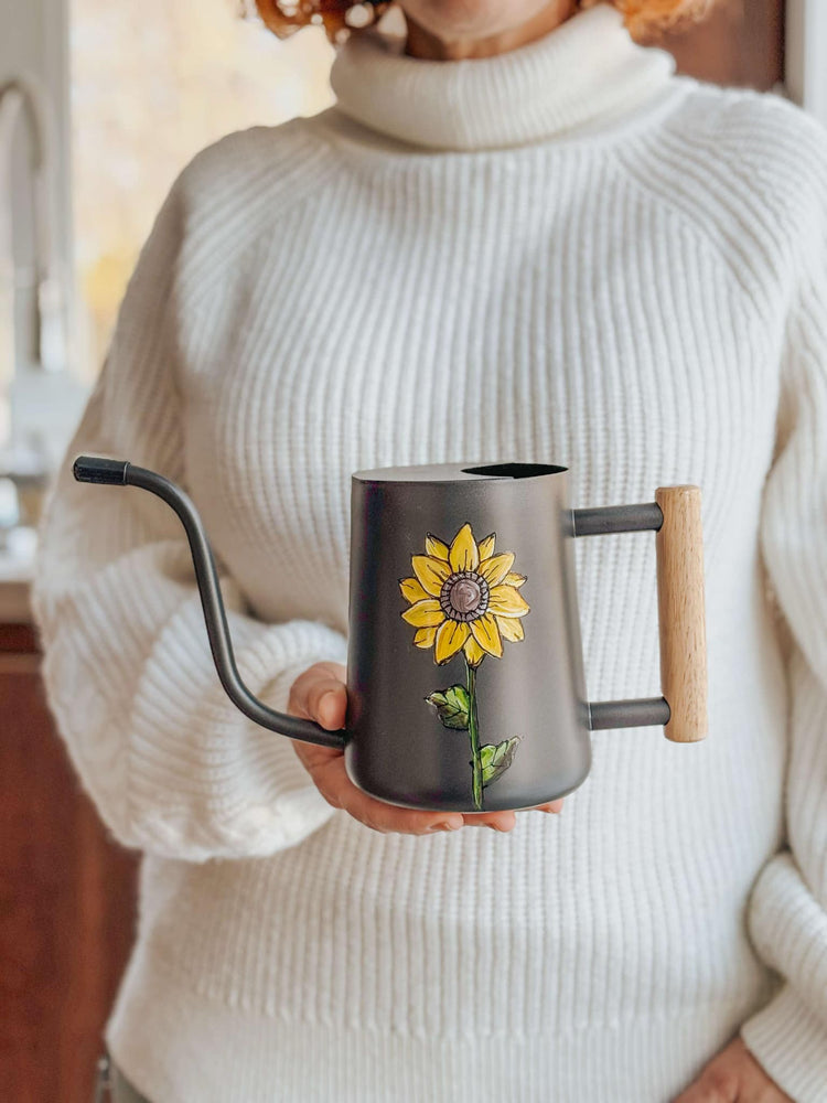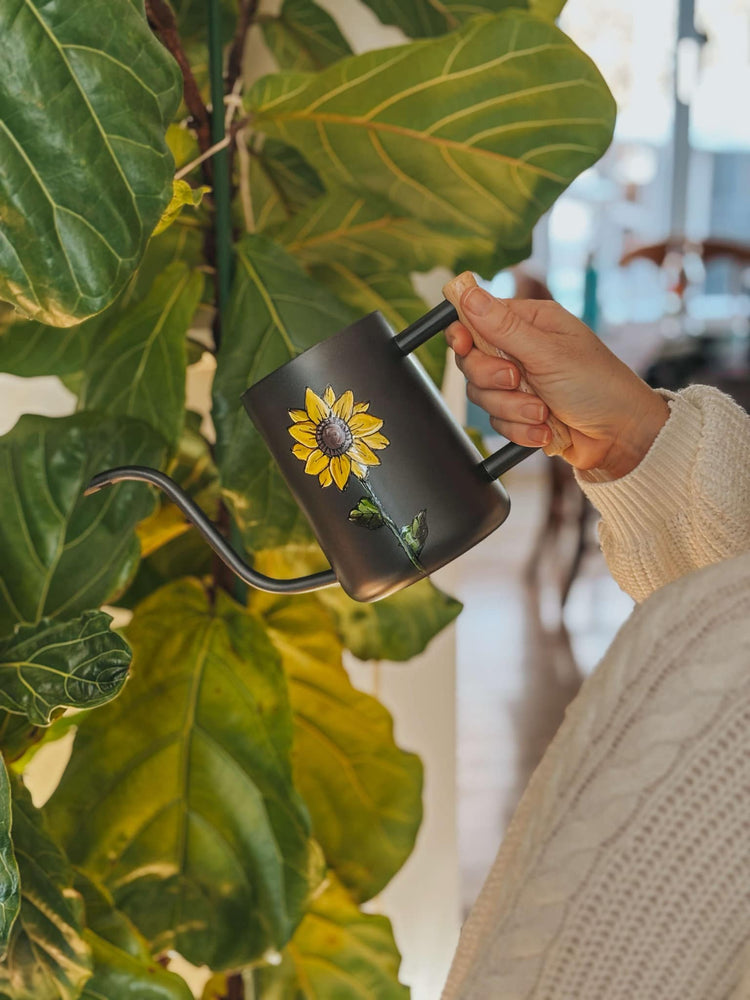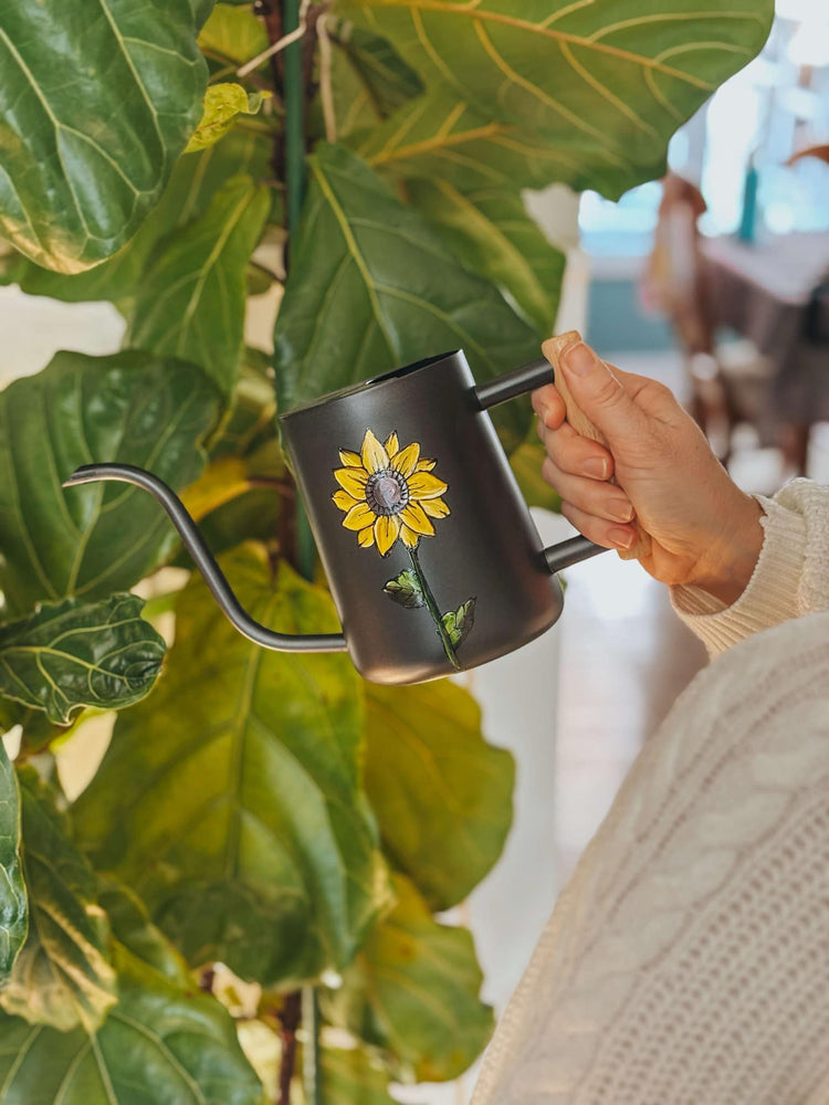 Check out this black metal watering can, it is hand painted with a sunflower flower design. Holds 35 oz or 1 L.