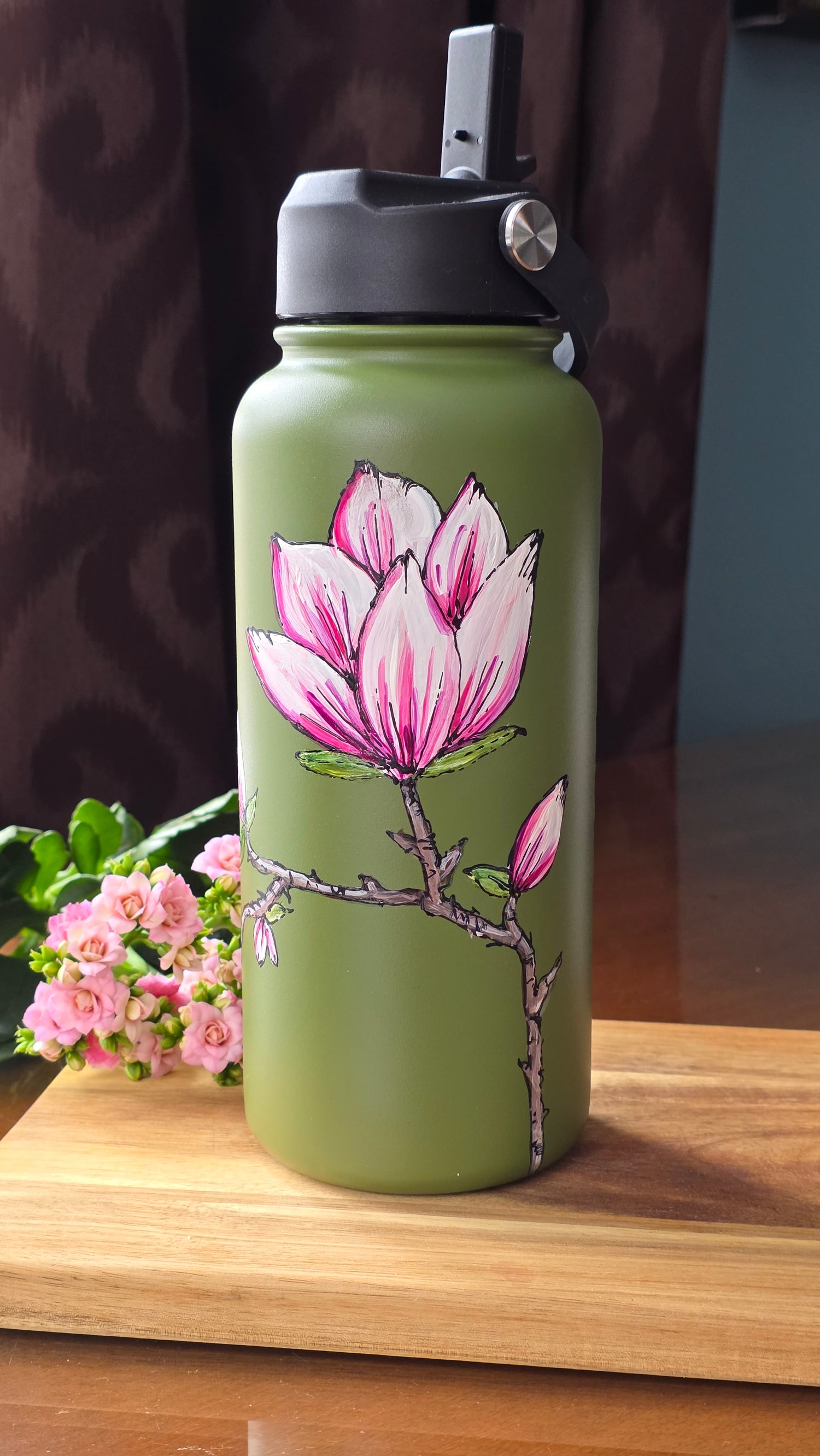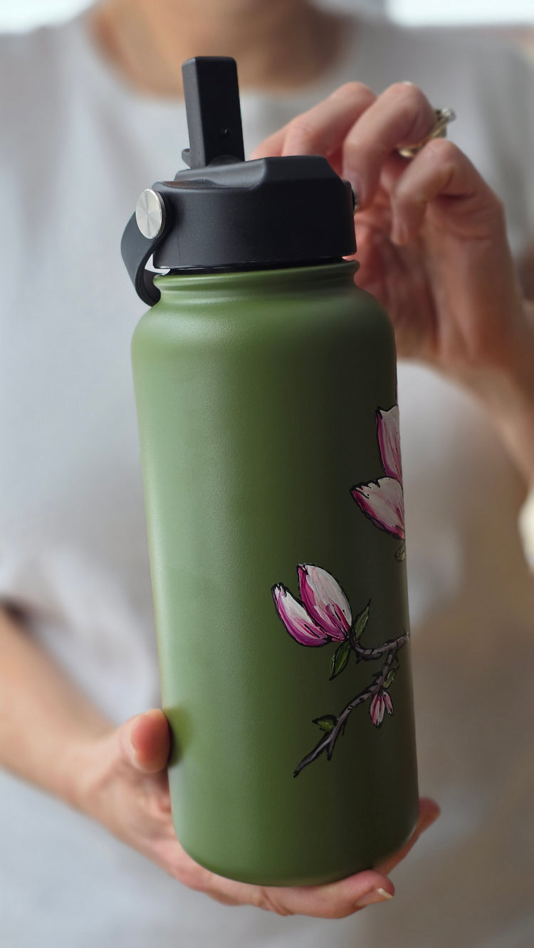 Large insulated olive green bottle , 32 oz size. It has a screw-on lid and a straw with a spout, so 2 ways to stay hydrated as you wish.