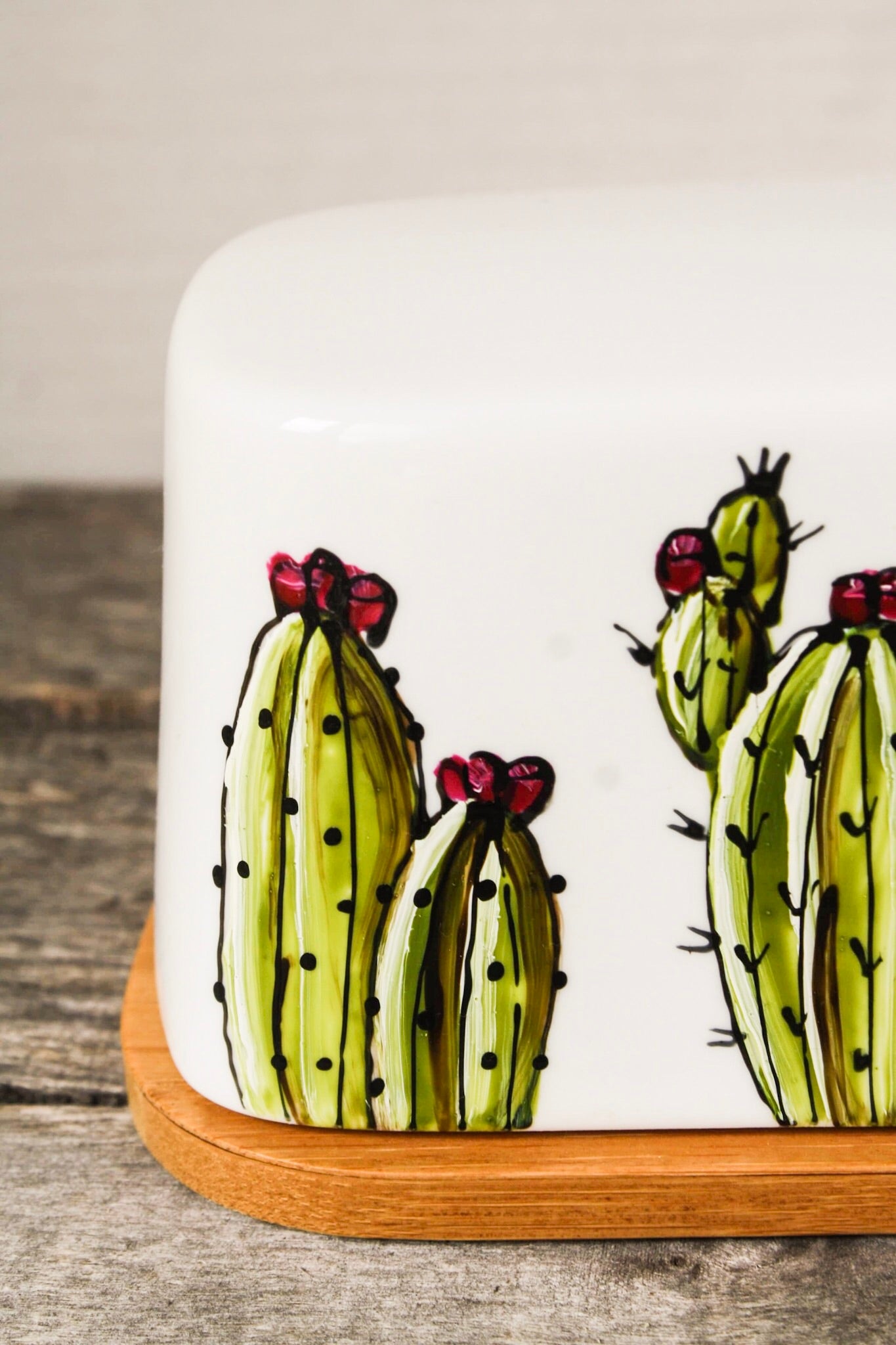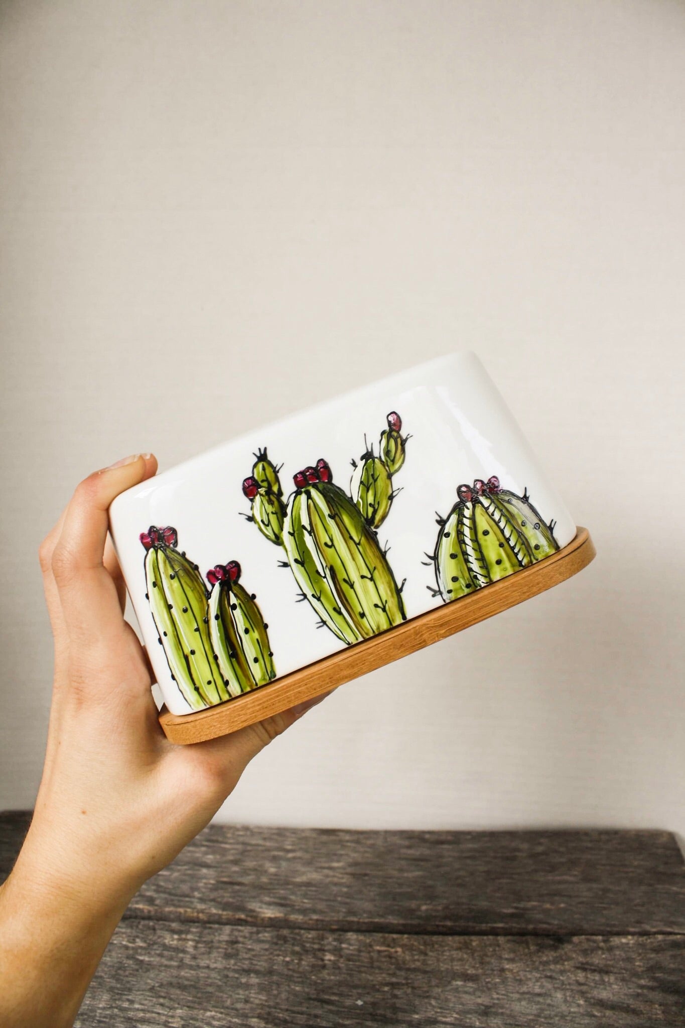 This butter dish with a 3 cactus design is hand painted by Pero.