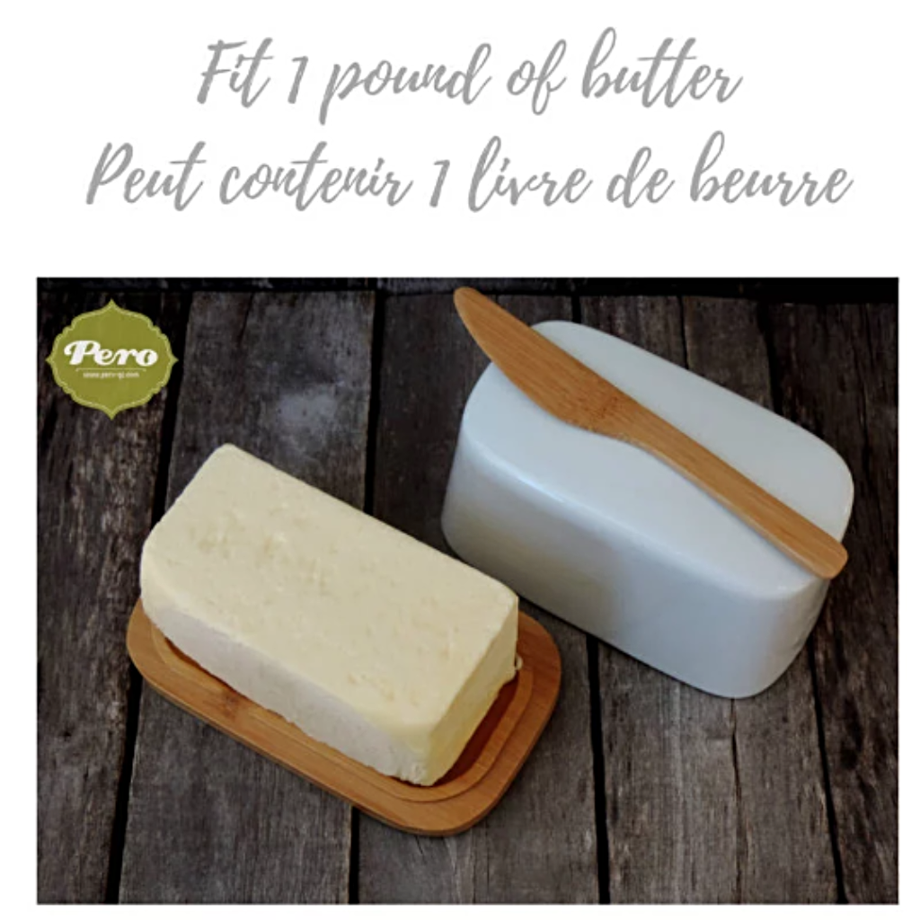 A pound of Canadian size butter goes completely inside. It has a bamboo base. It will quickly become the perfect gift.