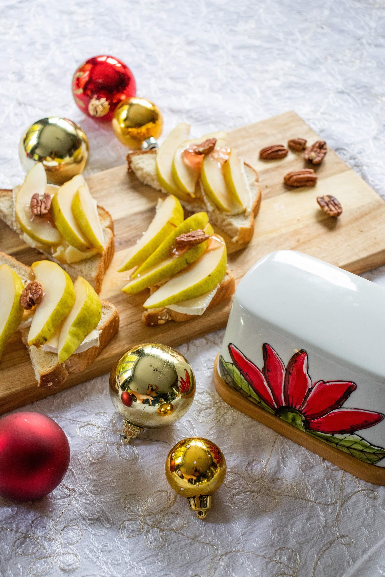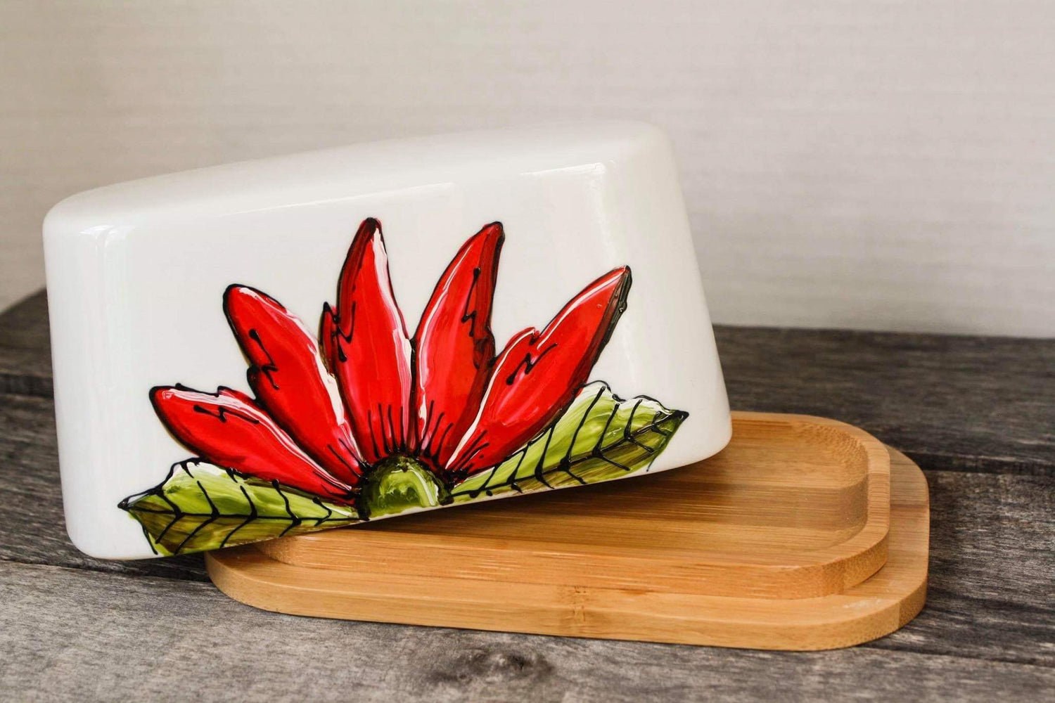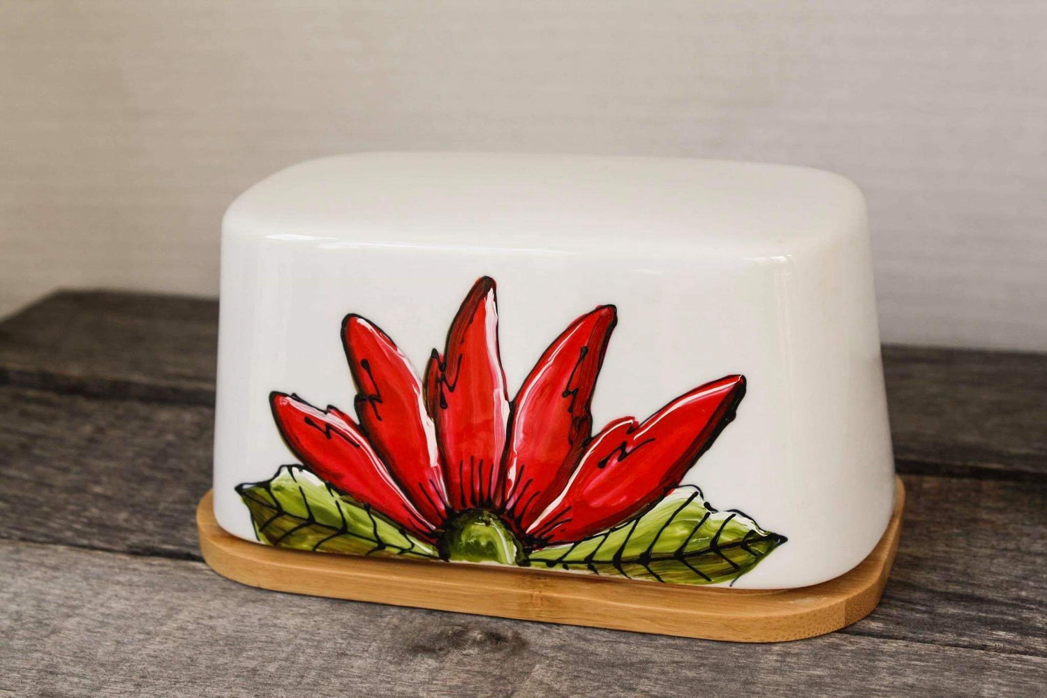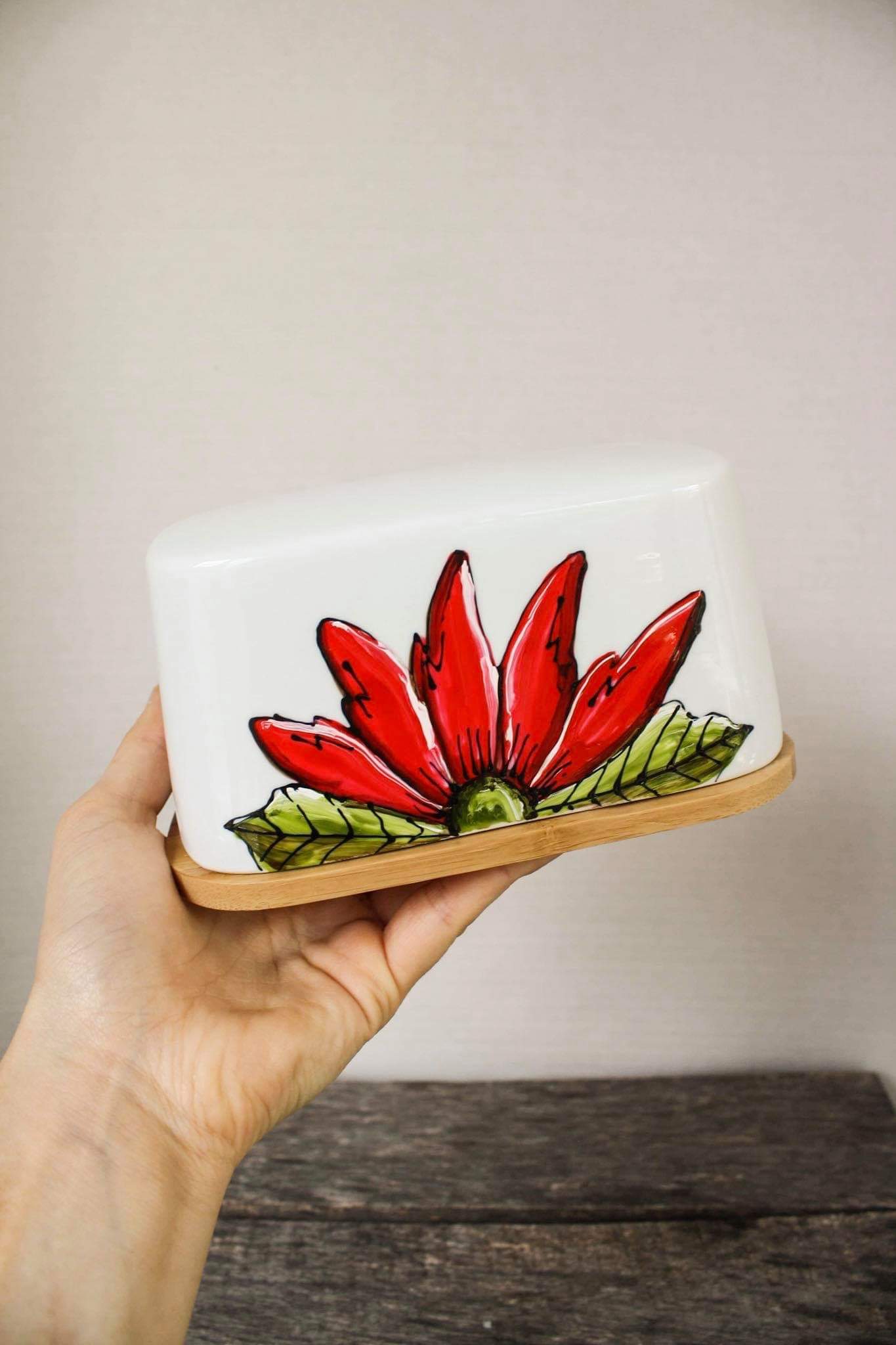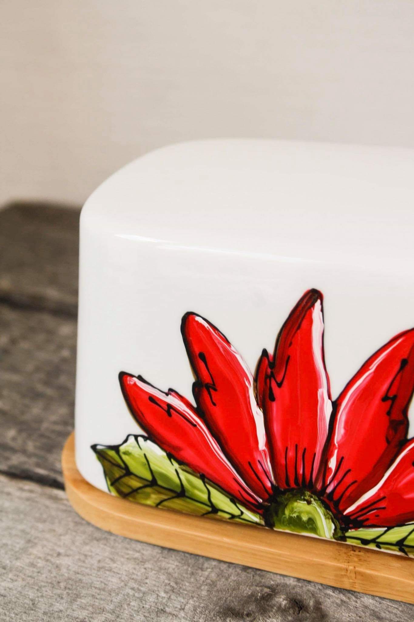 Butter dish with red half-flower design hand painted by Pero.