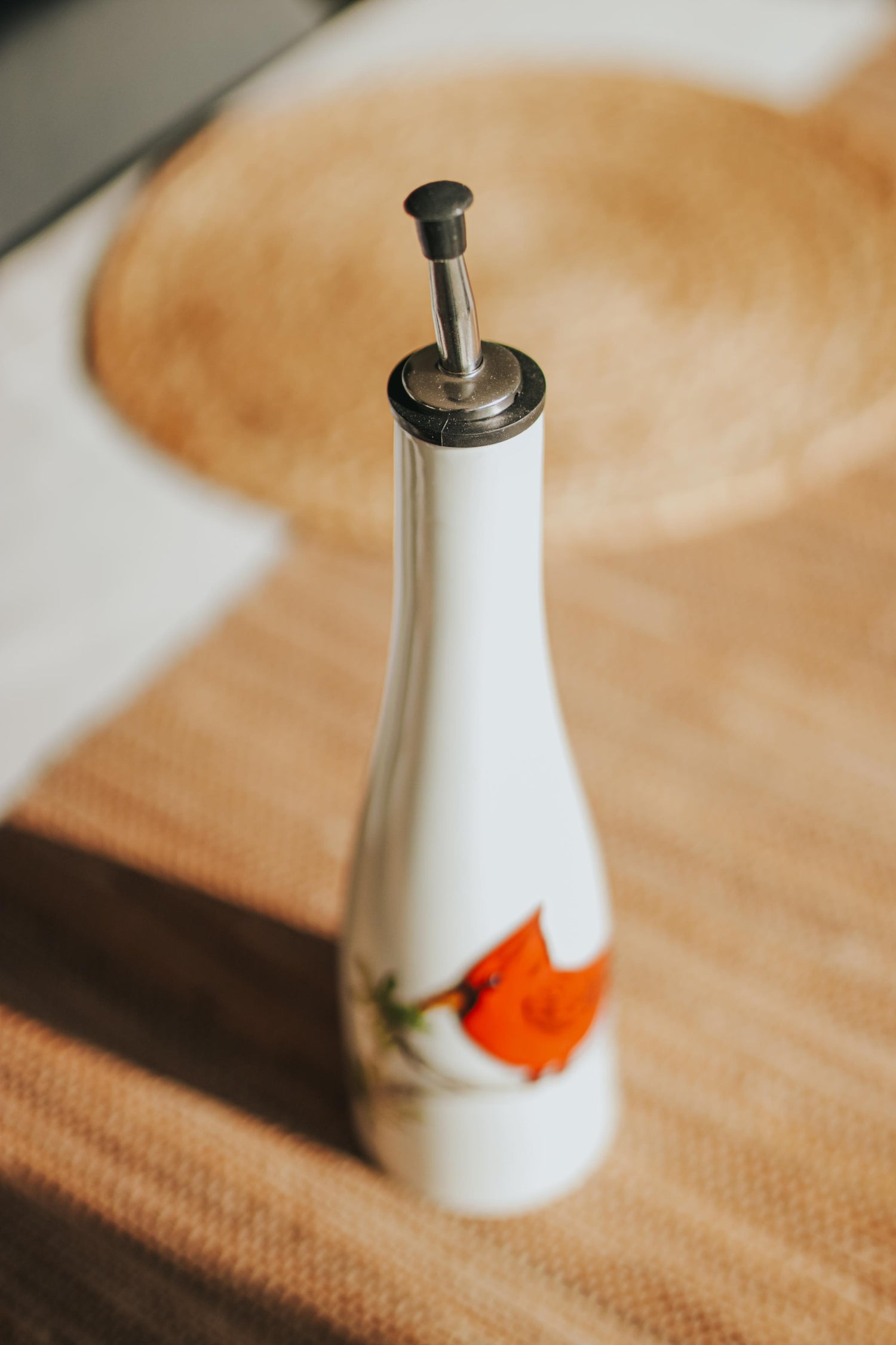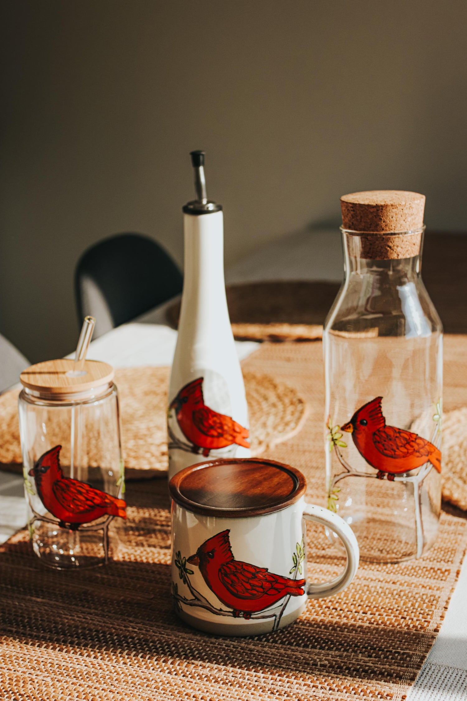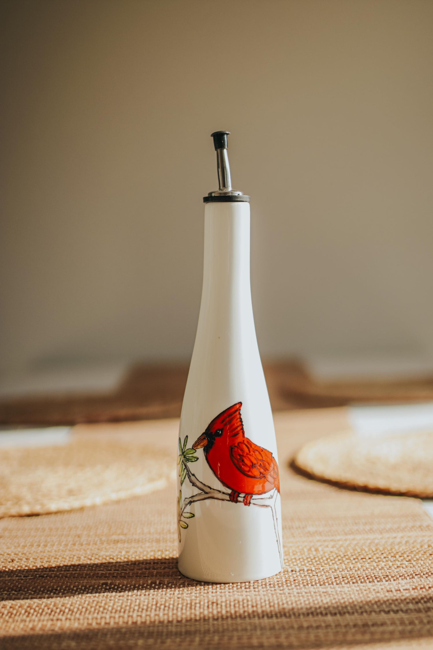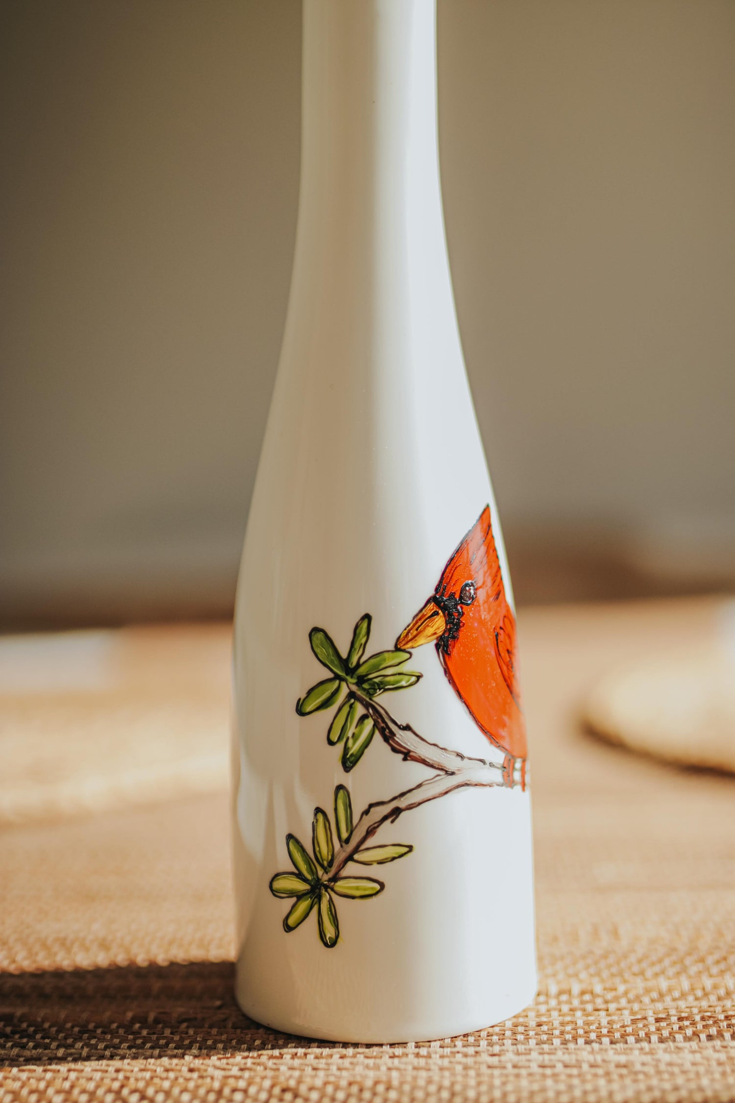 This beautiful hand painted stoneware bottle features a gorgeous cardinal bird and is perfect for nature lovers!