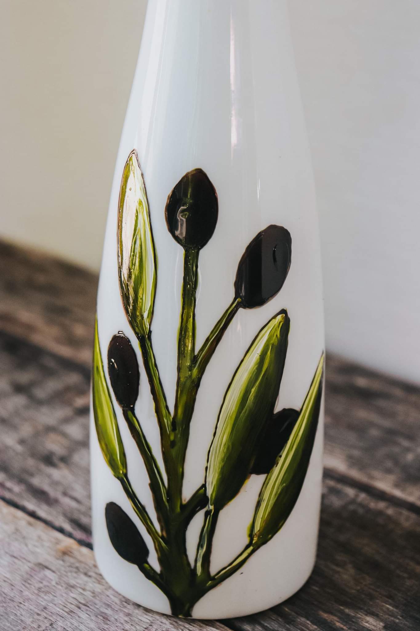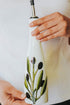This hand-painted white stoneware bottle features a drawing of an olive branch, making it a unique and original gift.