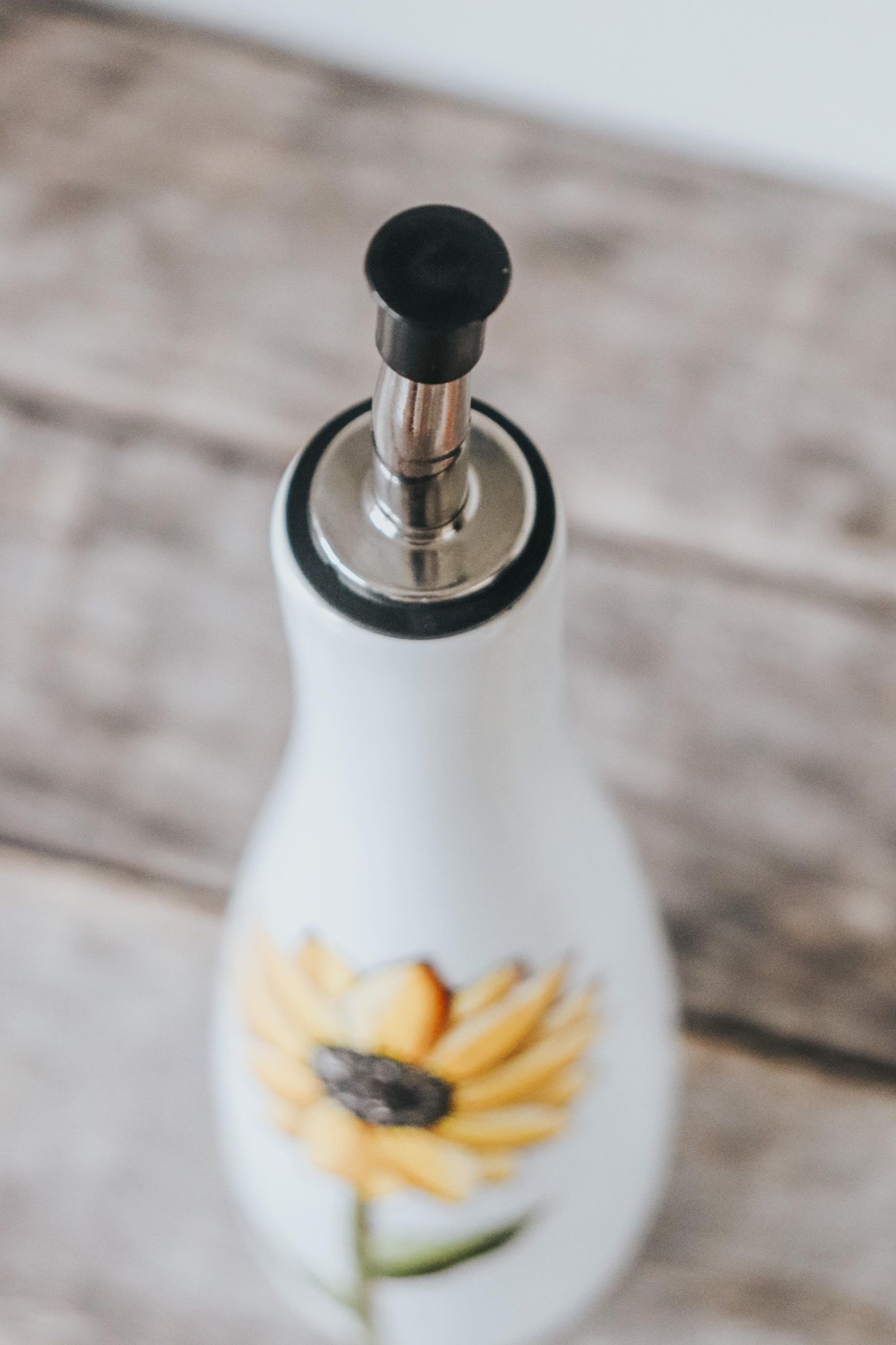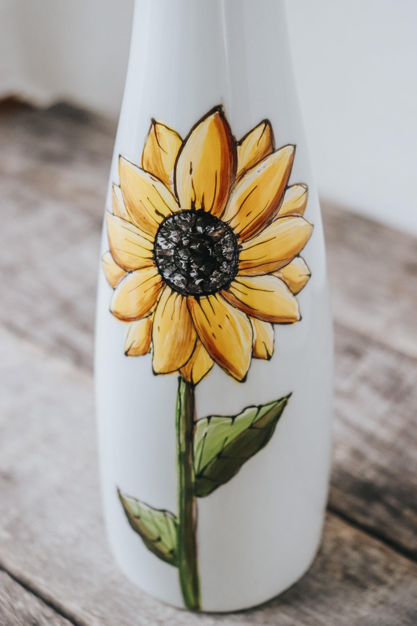 This hand-painted white stoneware bottle features a sunflower design, making it a unique and original gift!