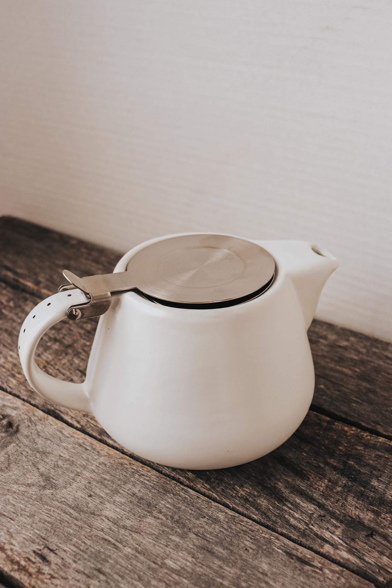 Red flower design infusion teapot with a capacity of 22 oz or 650 mL, white matte stoneware color, with stainless steel lid and infusion basket.