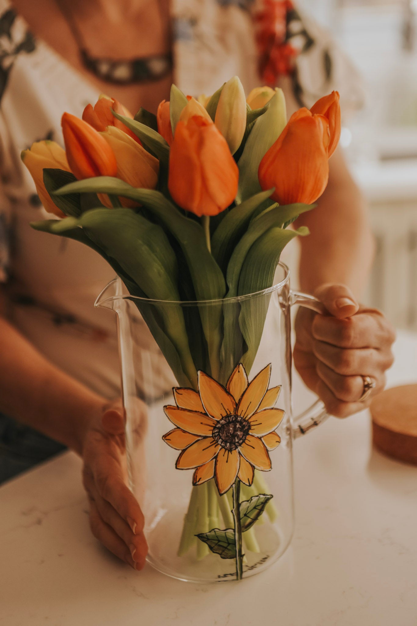 Glass water carafe, hand painted sunflower design with cork stopper.