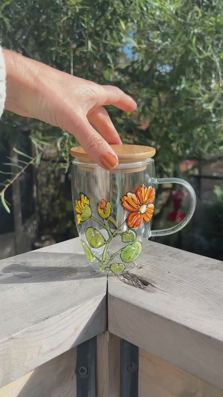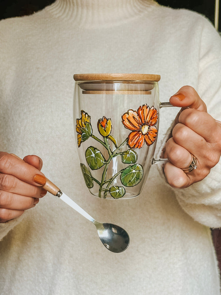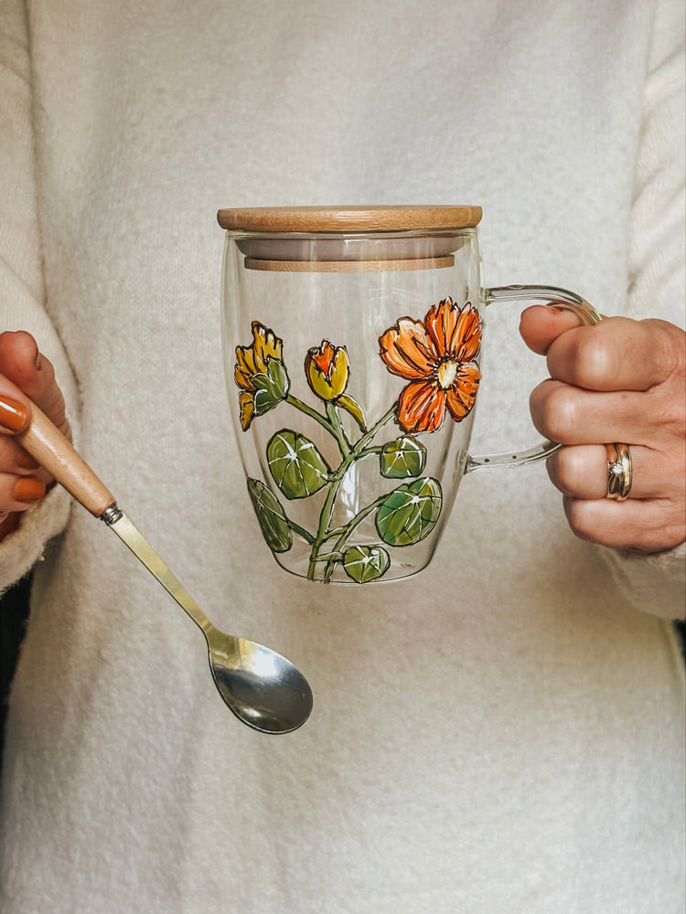 What a joy you will have to enjoy your comforting beverage in such a colorful cup. It comes with a bamboo lid and a matching spoon.