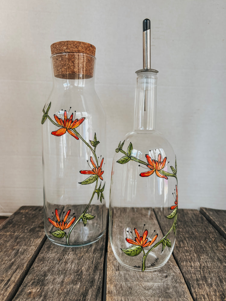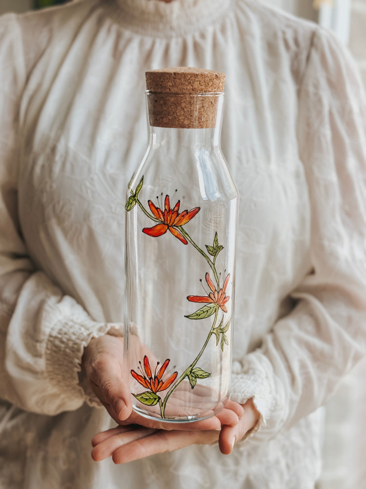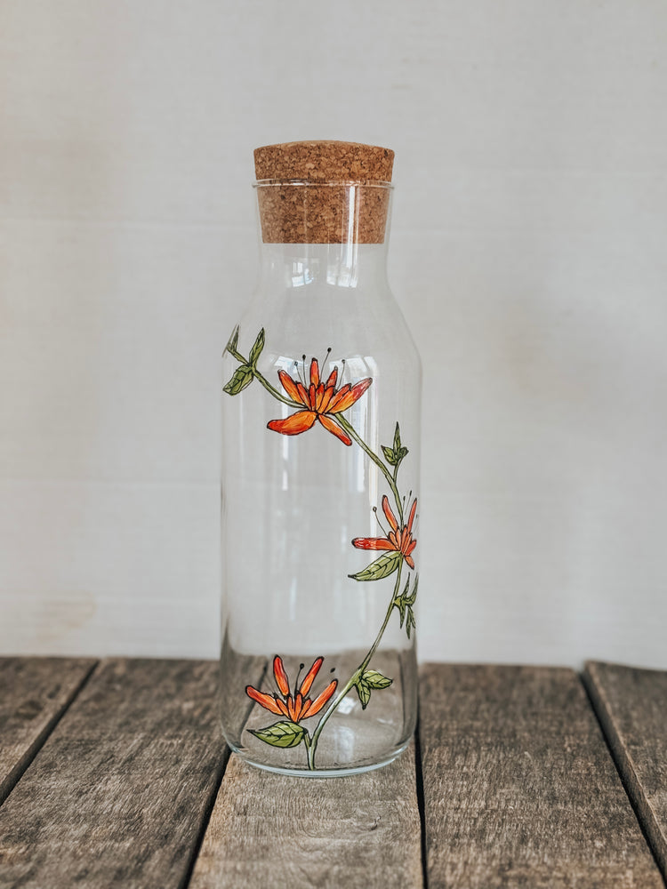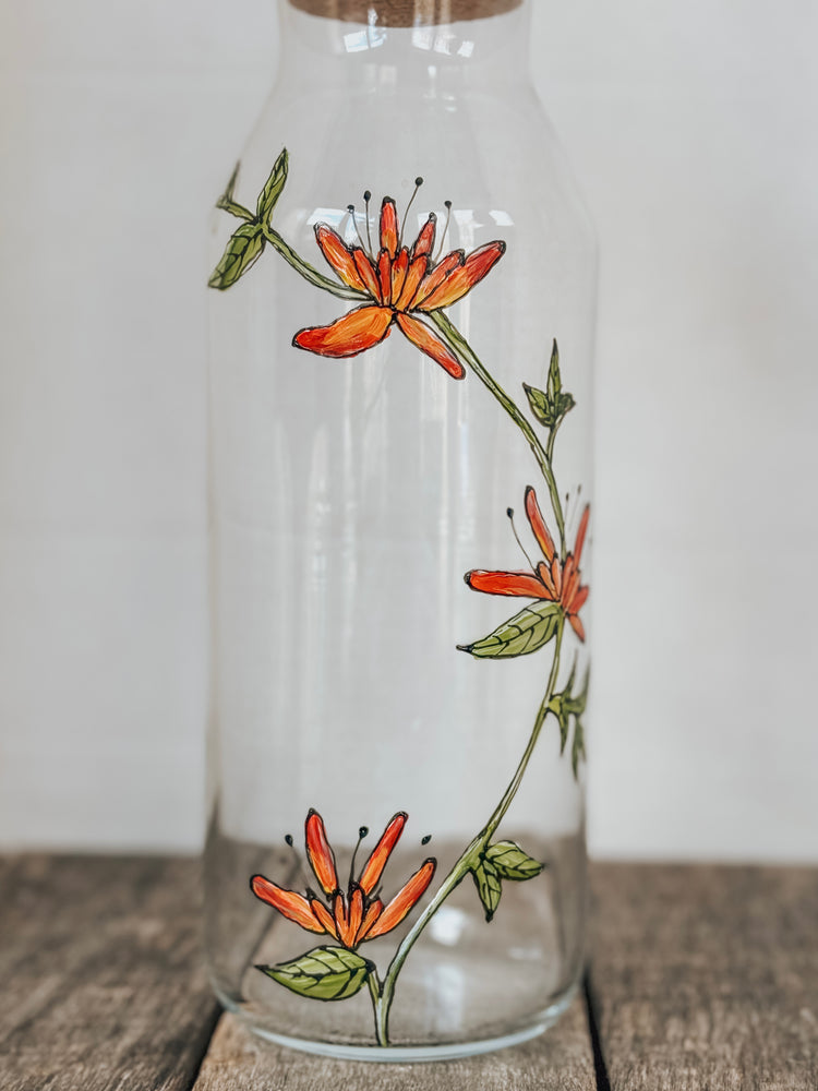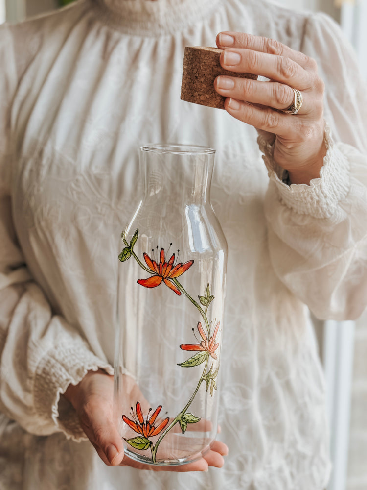 Glass water carafe, hand painted abstract flower design with cork stopper.