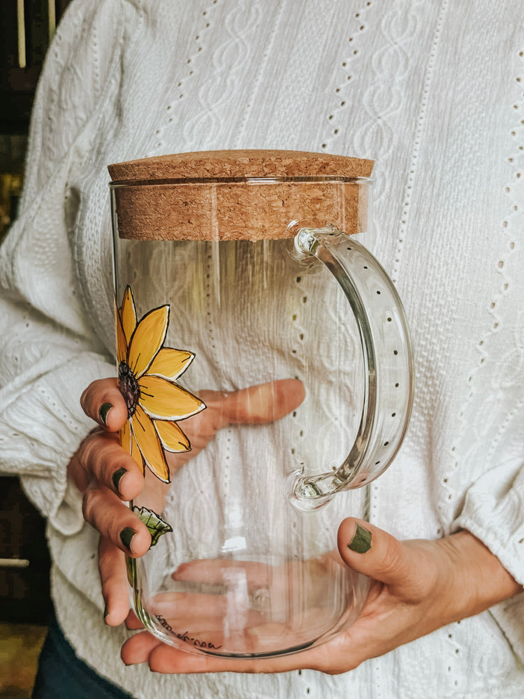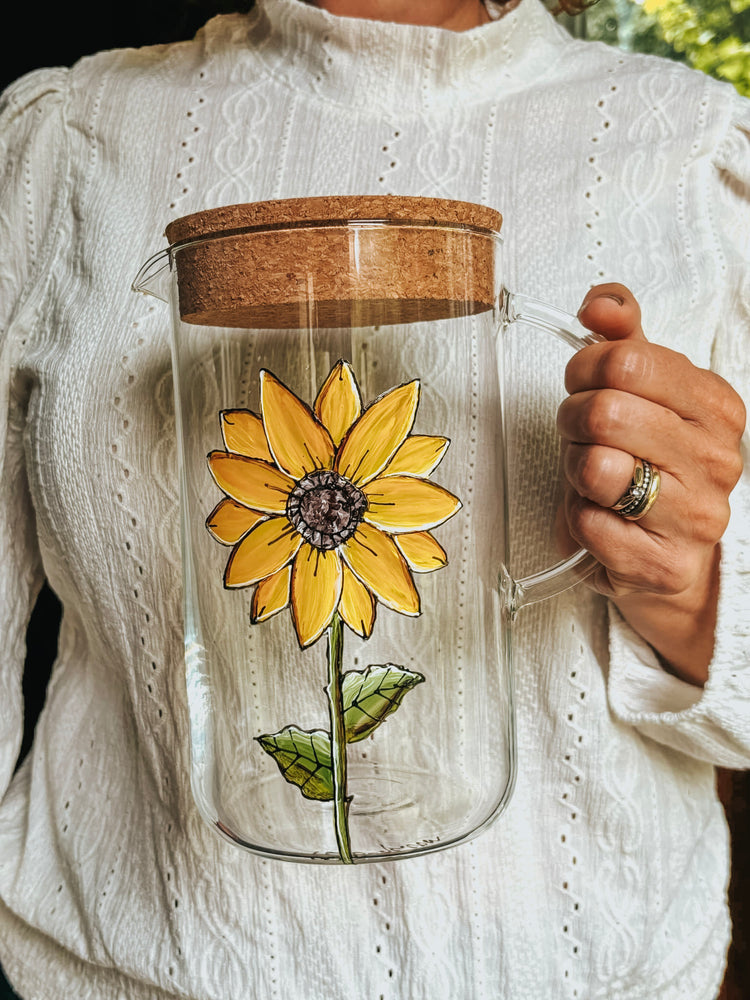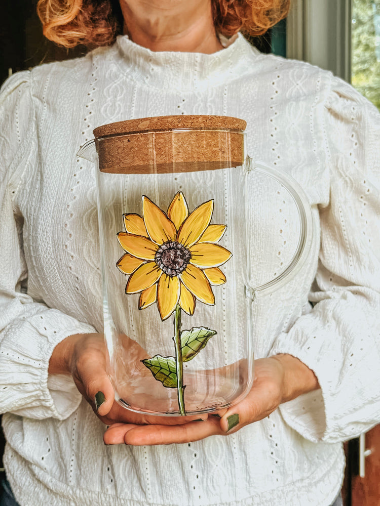 Glass water carafe, hand painted sunflower design with cork stopper.