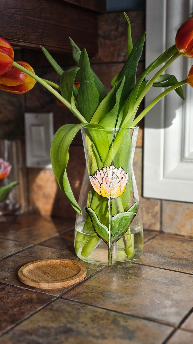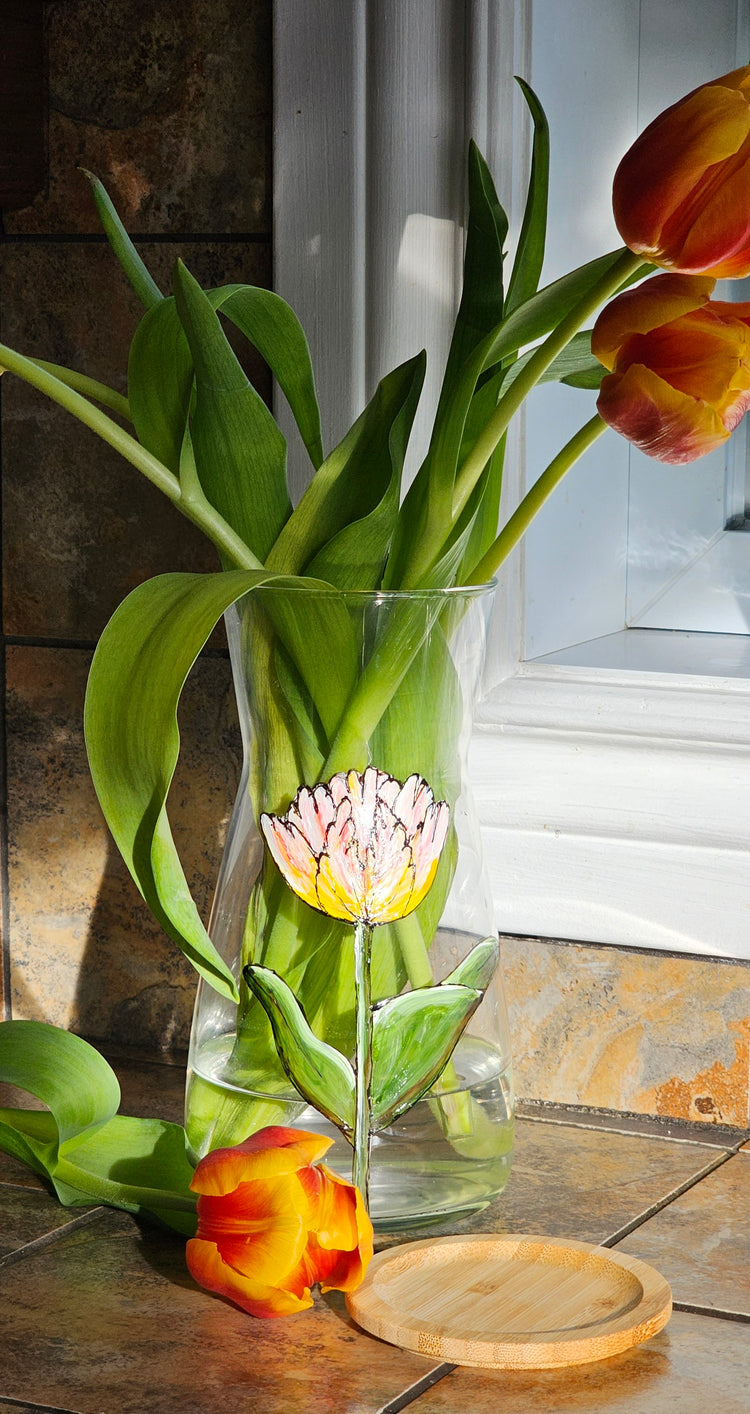 Discover this glass water carafe with a design of a magnificent hand-painted colorful tulip with a cork stopper.
