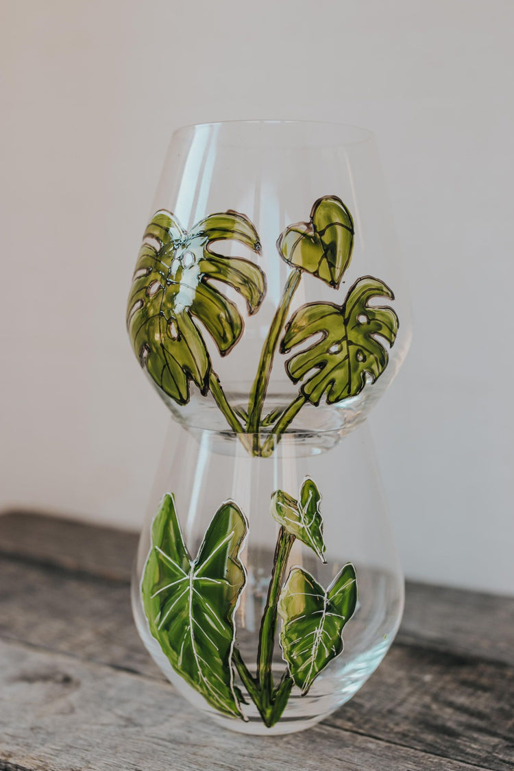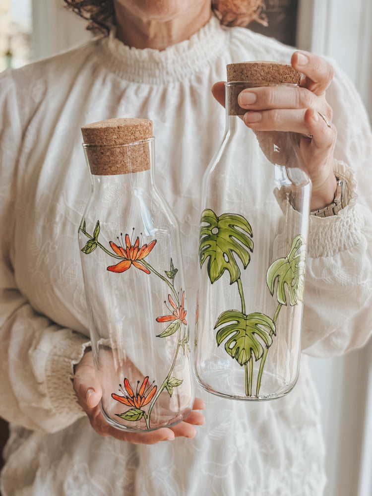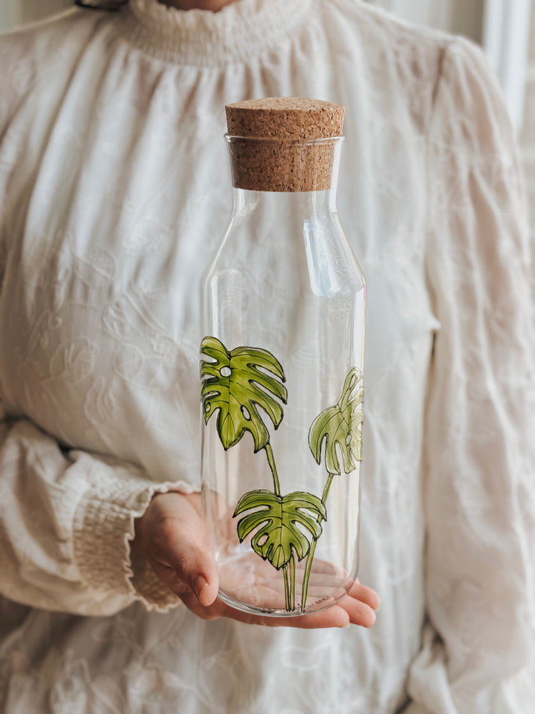 Glass water carafe, hand-painted monstera plant design with cork stopper.