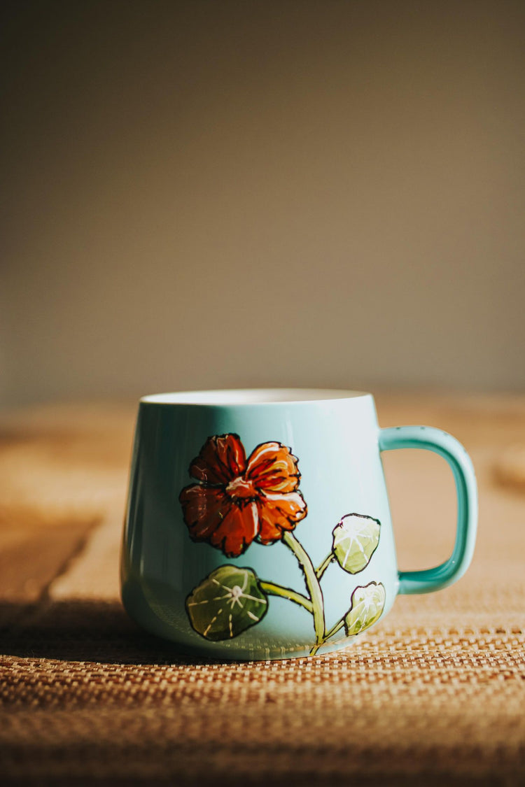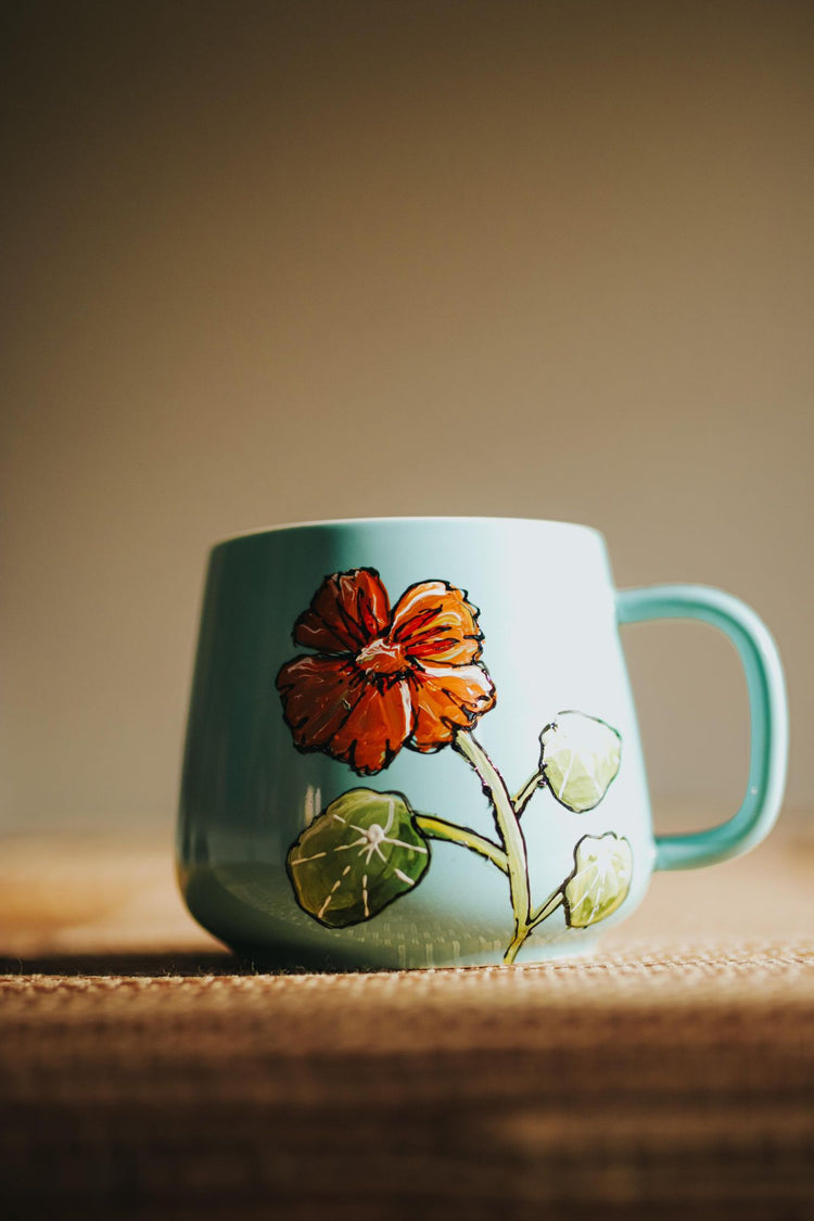 Le contraste de couleur de la fleur orange sur le fond bleuté de la tasse est incroyable.