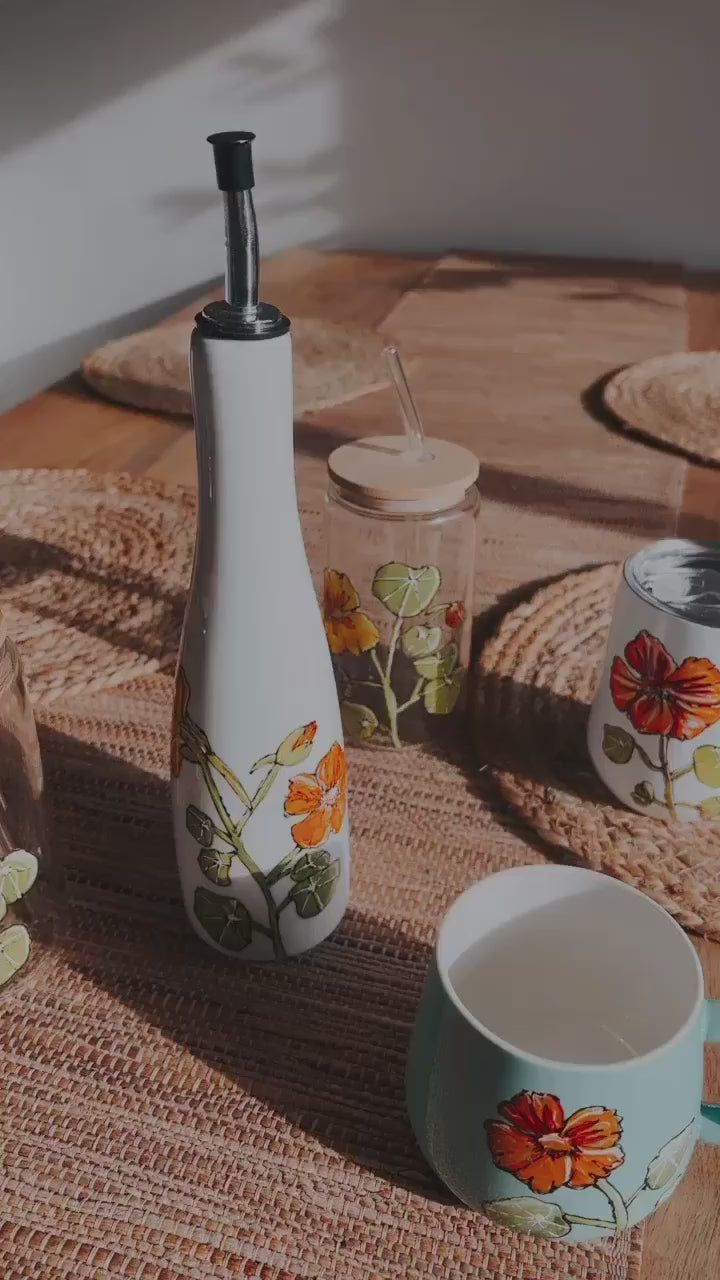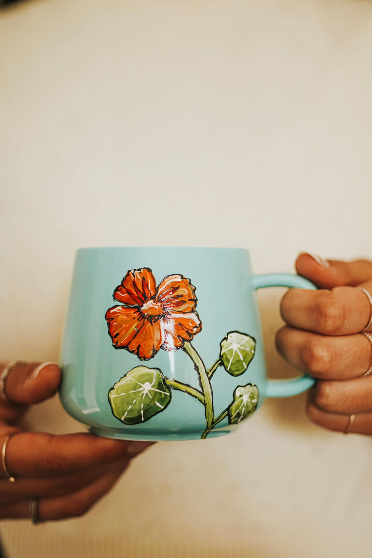 Treat yourself to this hand-painted blue porcelain cup in a round and comforting format . Find a design of a beautiful orange nasturtium flower signed Pero.