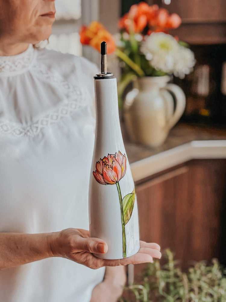 Stoneware bottle with colorful tulip design, hand-painted by Pero