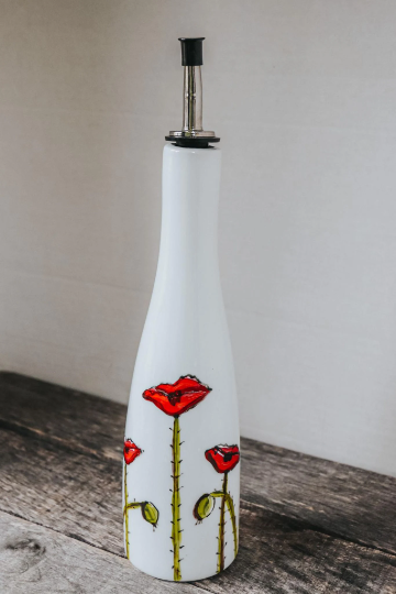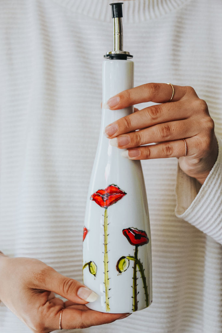 Sur cette bouteille en grès blanc peinte à la main, on y retrouve un dessin de coquelicots, elle devient donc un cadeau unique et original!