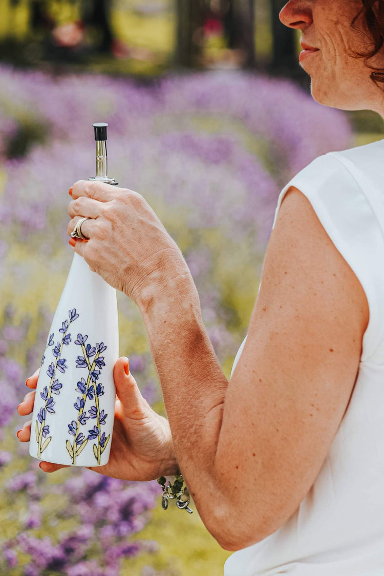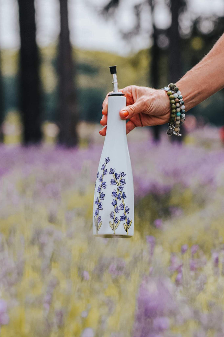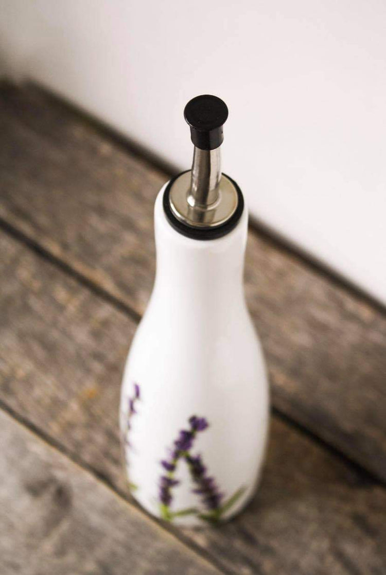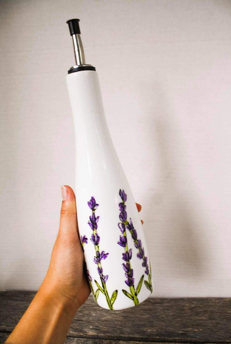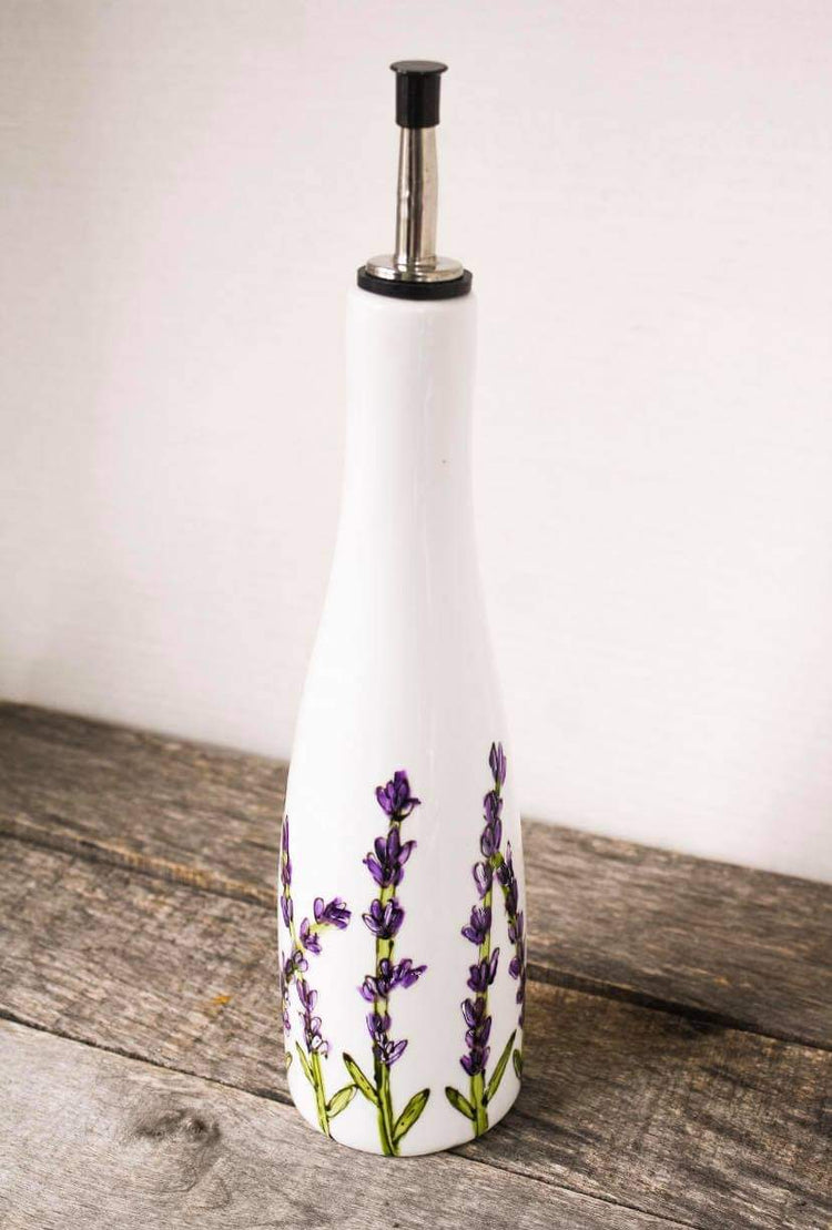 Cette bouteille en grès blanc, peinte à la main, est le compagnon idéal pour présenter de l’huile d’olive ou du vinaigre de qualité, du savon à vaisselle et même du sirop d'érable avec un soupçon d'originalité pour votre comptoir ou votre table.