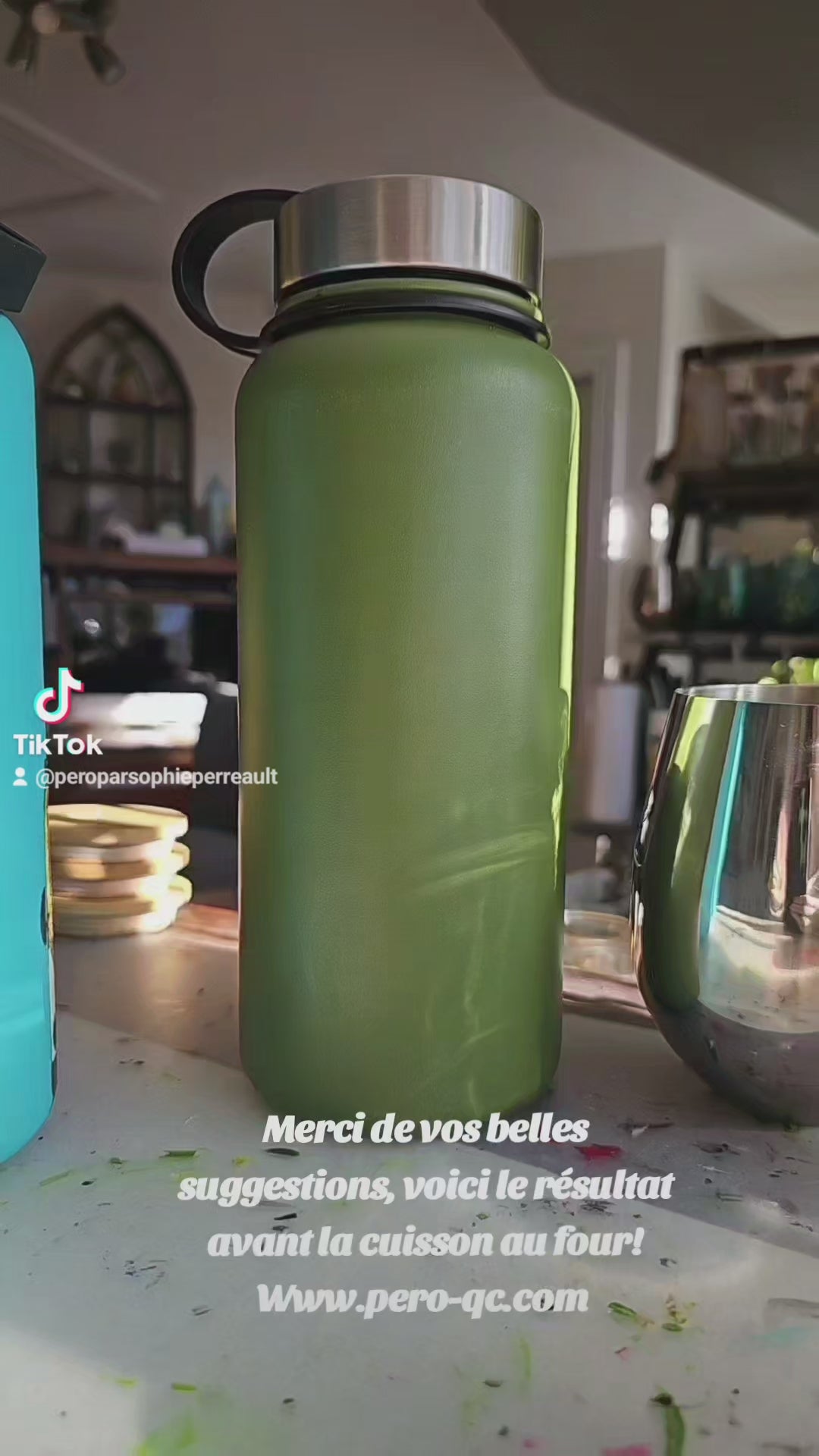 Grande bouteille isotherme couleur vert olive, format 32 oz. . Elle a un couvercle dévissable et une paille avec goulot, donc 2 façons de vous hydrater selon vos envies.