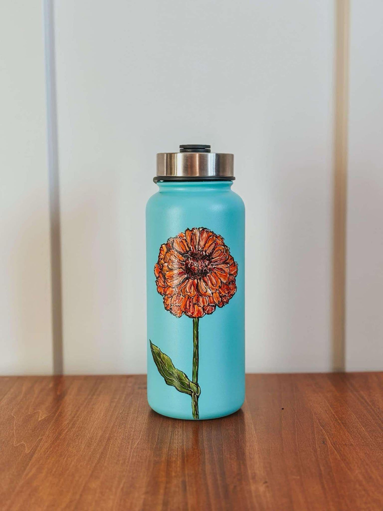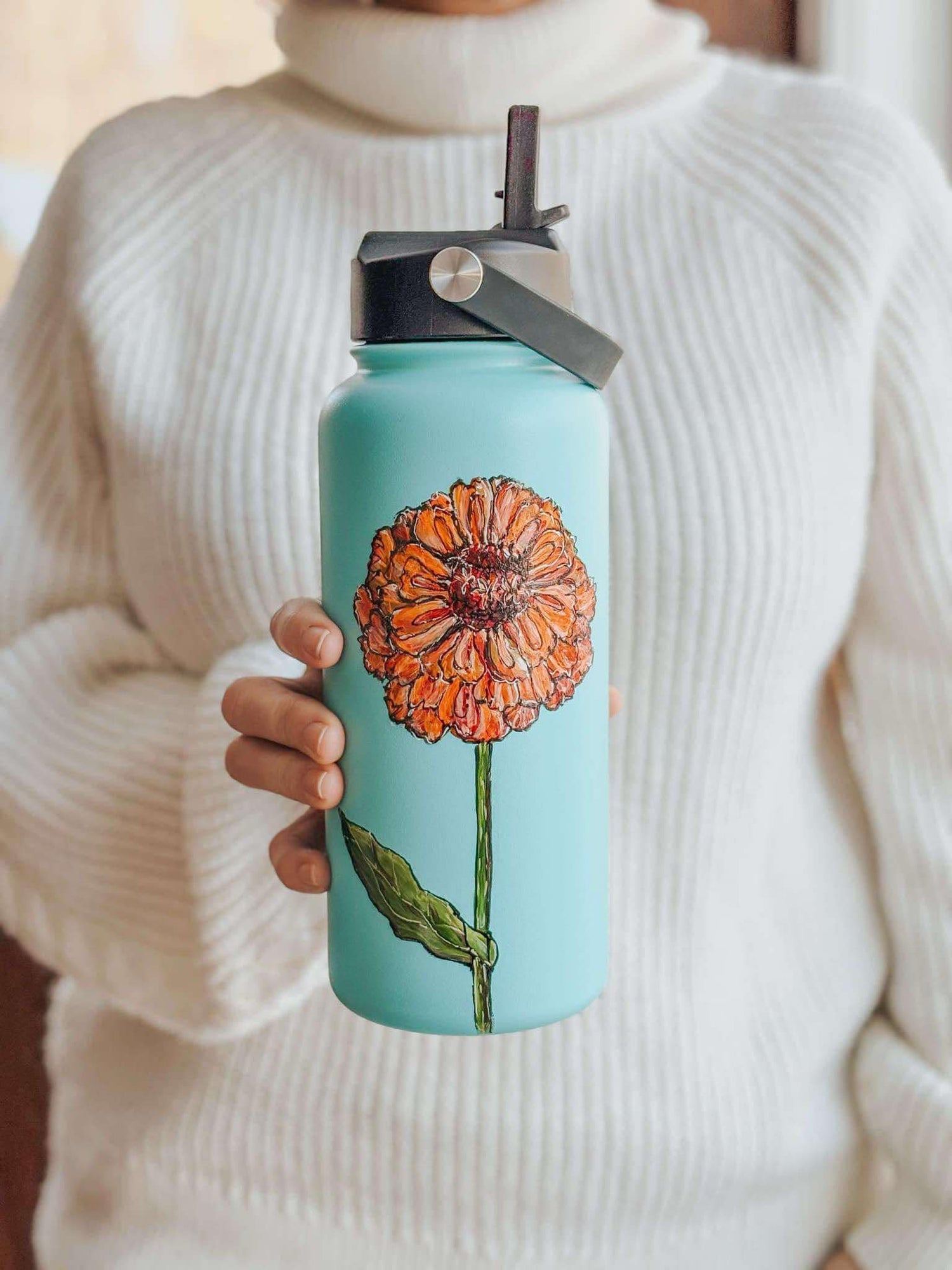 Un design peint à la main d'une fleur de fleur de zinia vient donner vie à cette gourde réutilisable qui vous suivra partout!