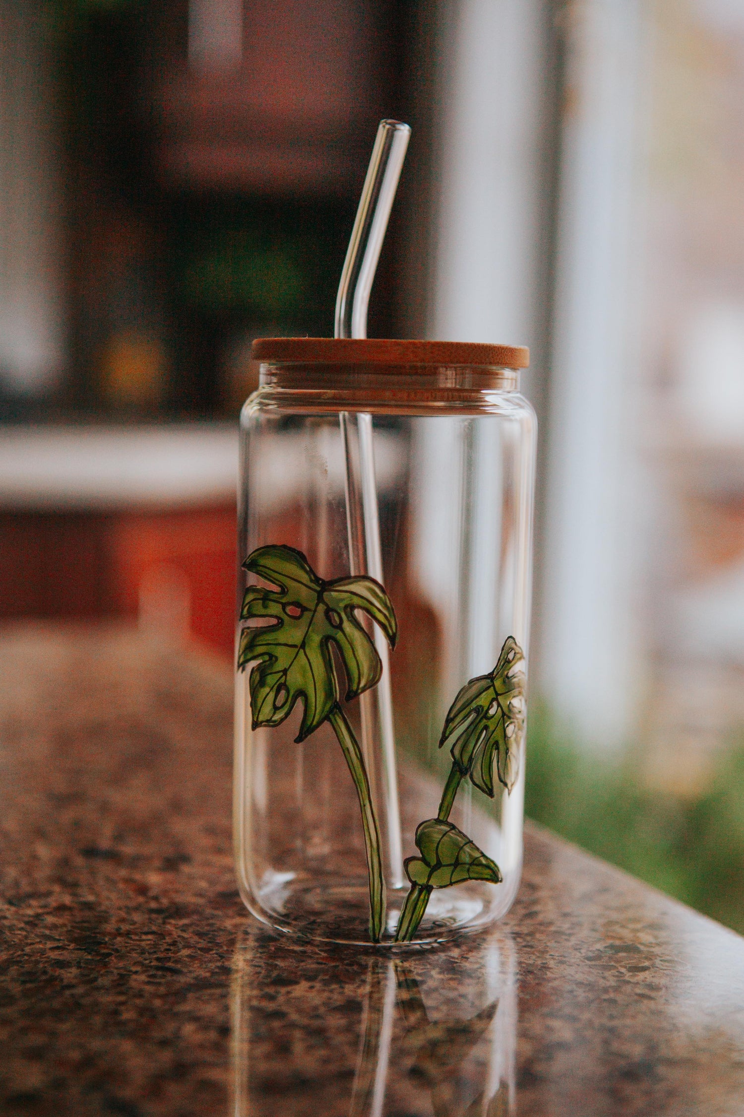 Obtenez ce verre de format canette au design d'une plante monstera peinte à la main.