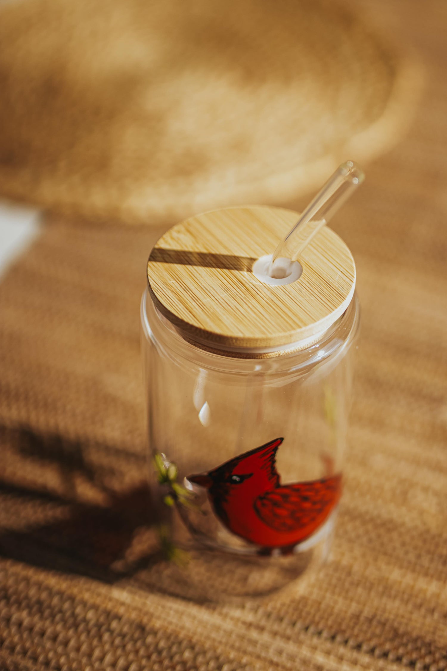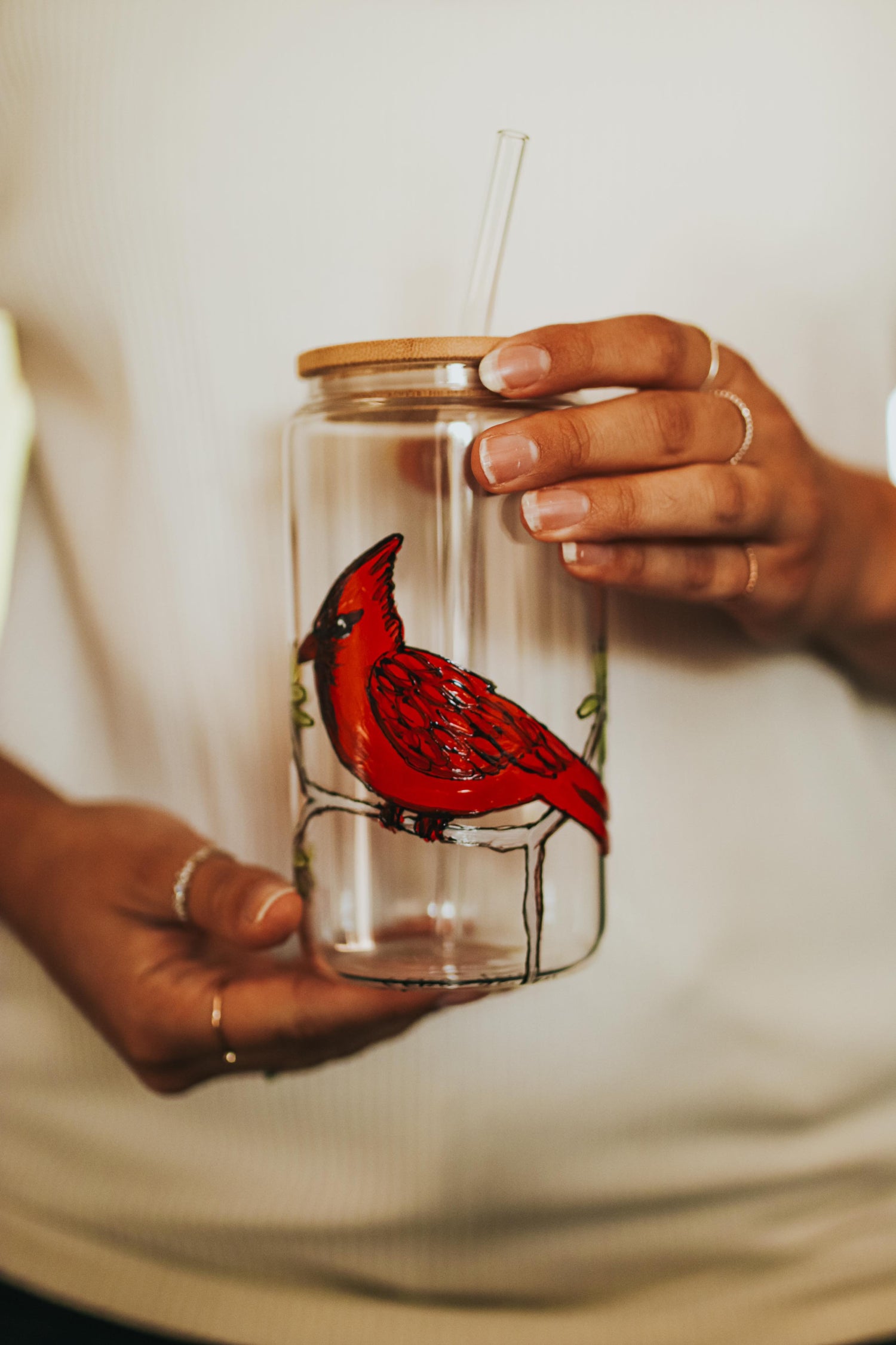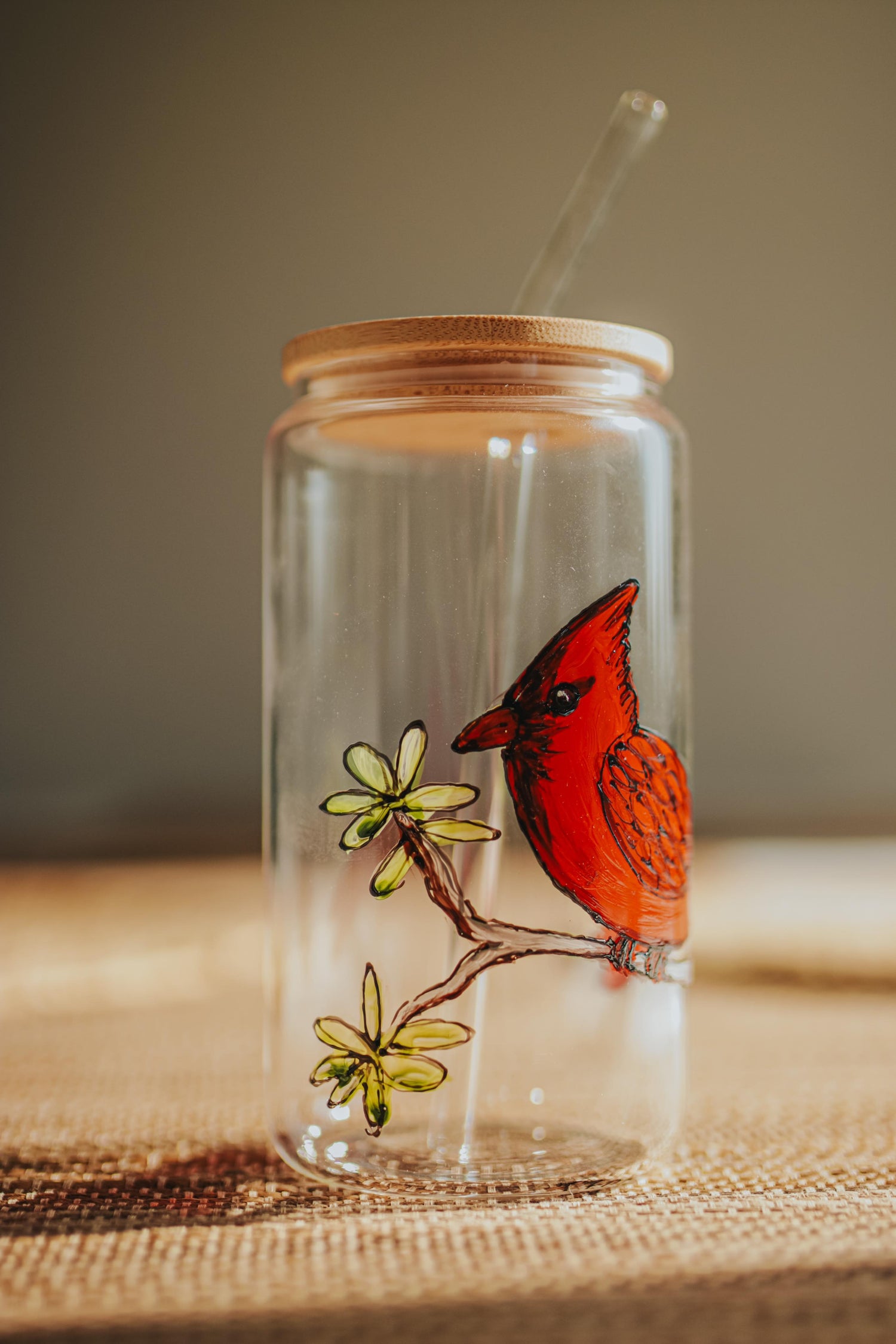 Ce verre format canette au design d'un cardinal est peint à la main. Il est le verre parfait pour un smoothie, un jus, une boisson chaude ou un cocktail.