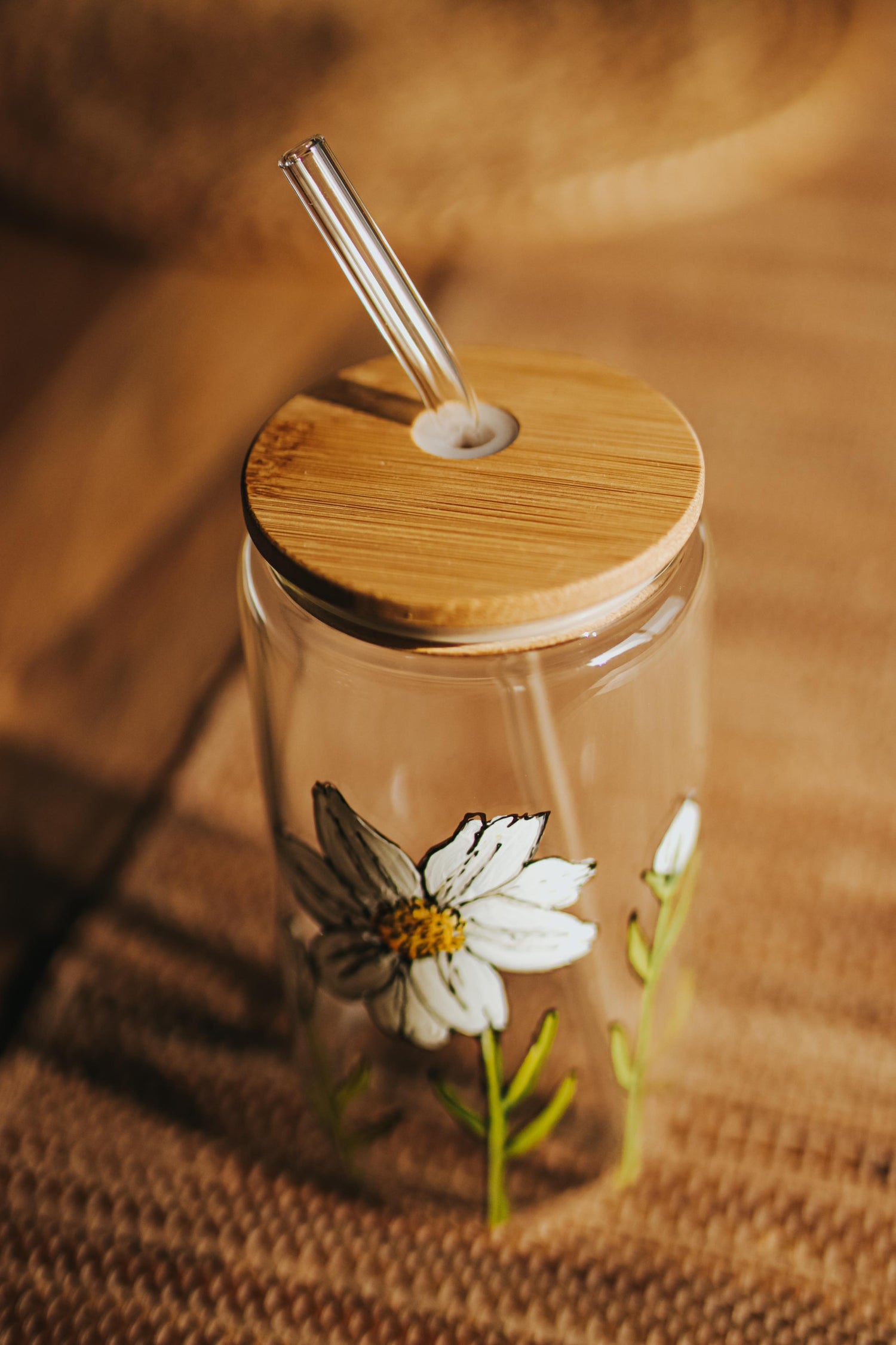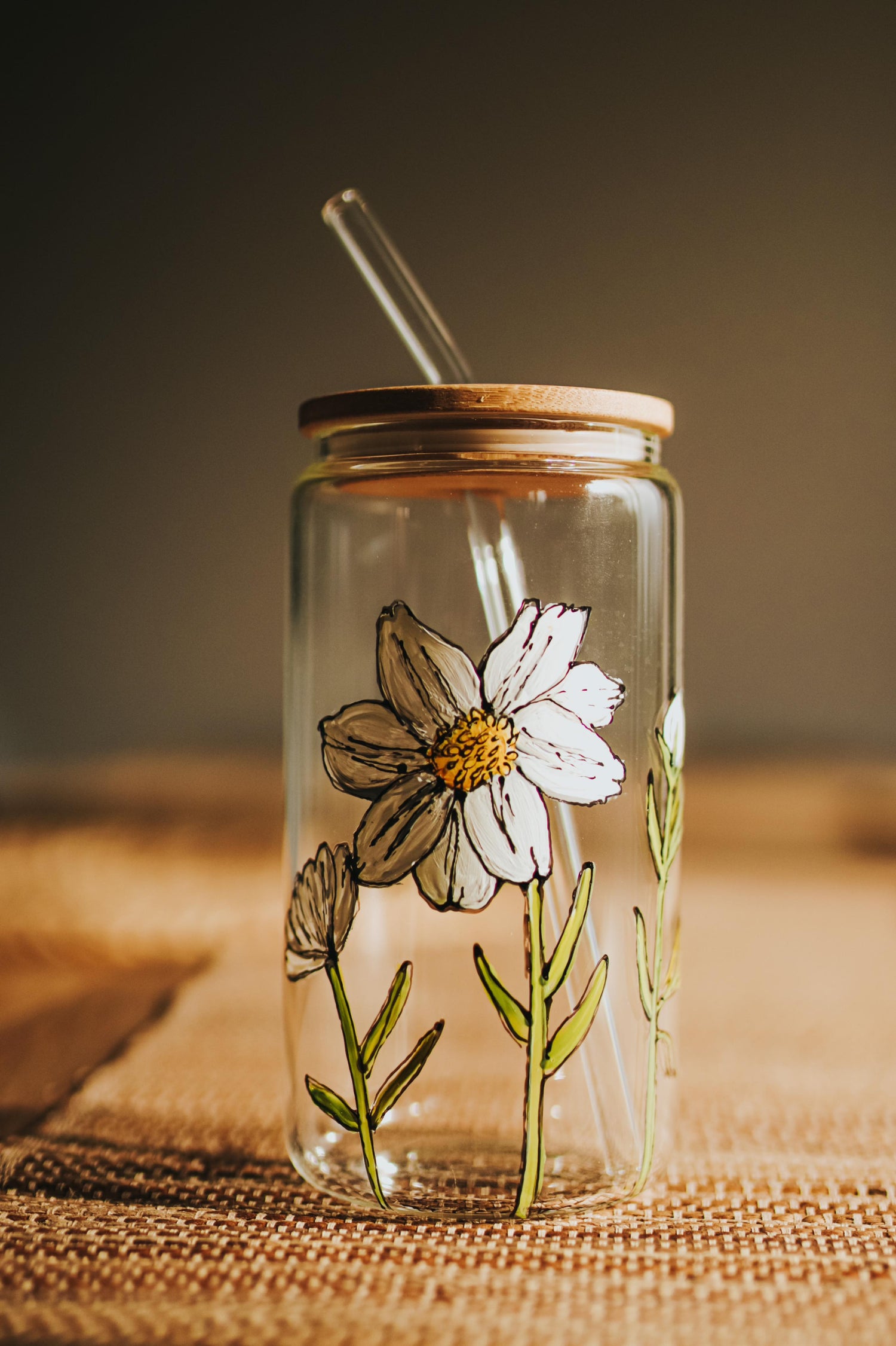 Ce verre canette au design de fleurs cosmos blanc est peint à la main. Il est le cadeau parfait pour un smoothie, un jus, une boisson chaude ou un cocktail.
