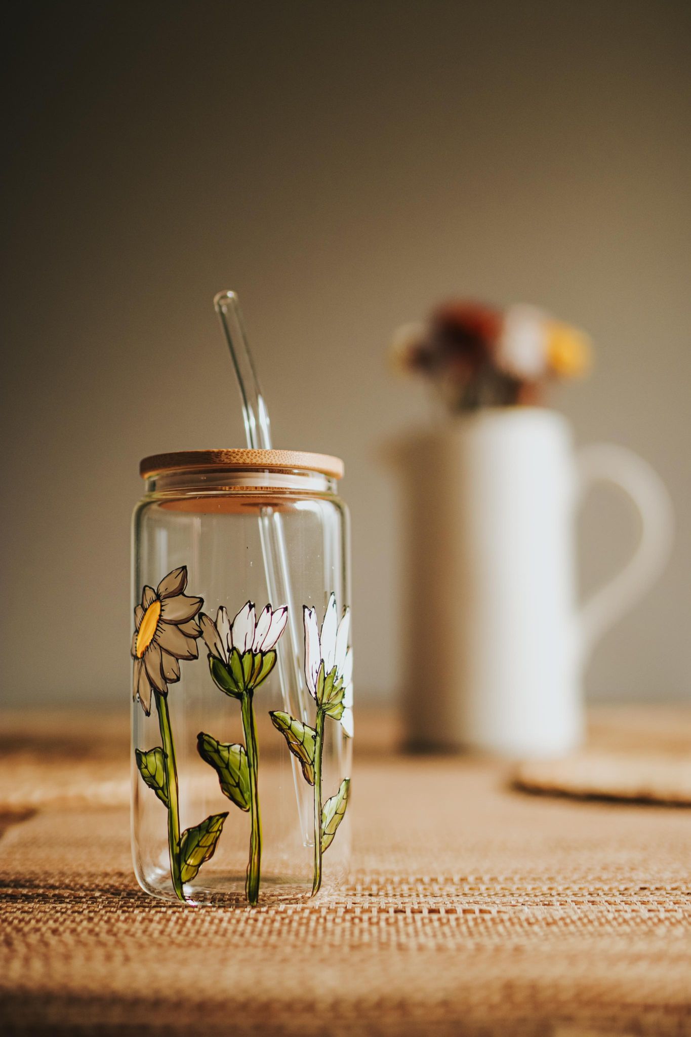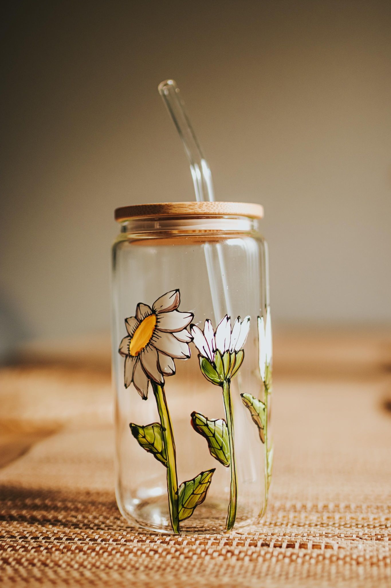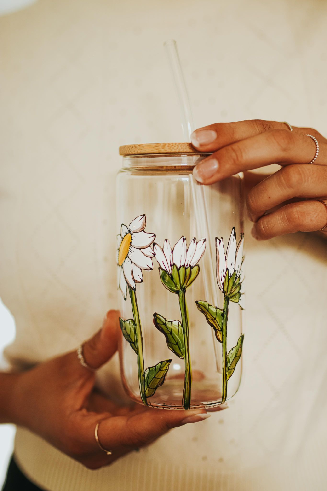 Retrouvez sur ce verre canette un design de 3 marguerites blanches peintes à la main. Il est le cadeau parfait pour un smoothie, un jus, une boisson chaude ou un cocktail.