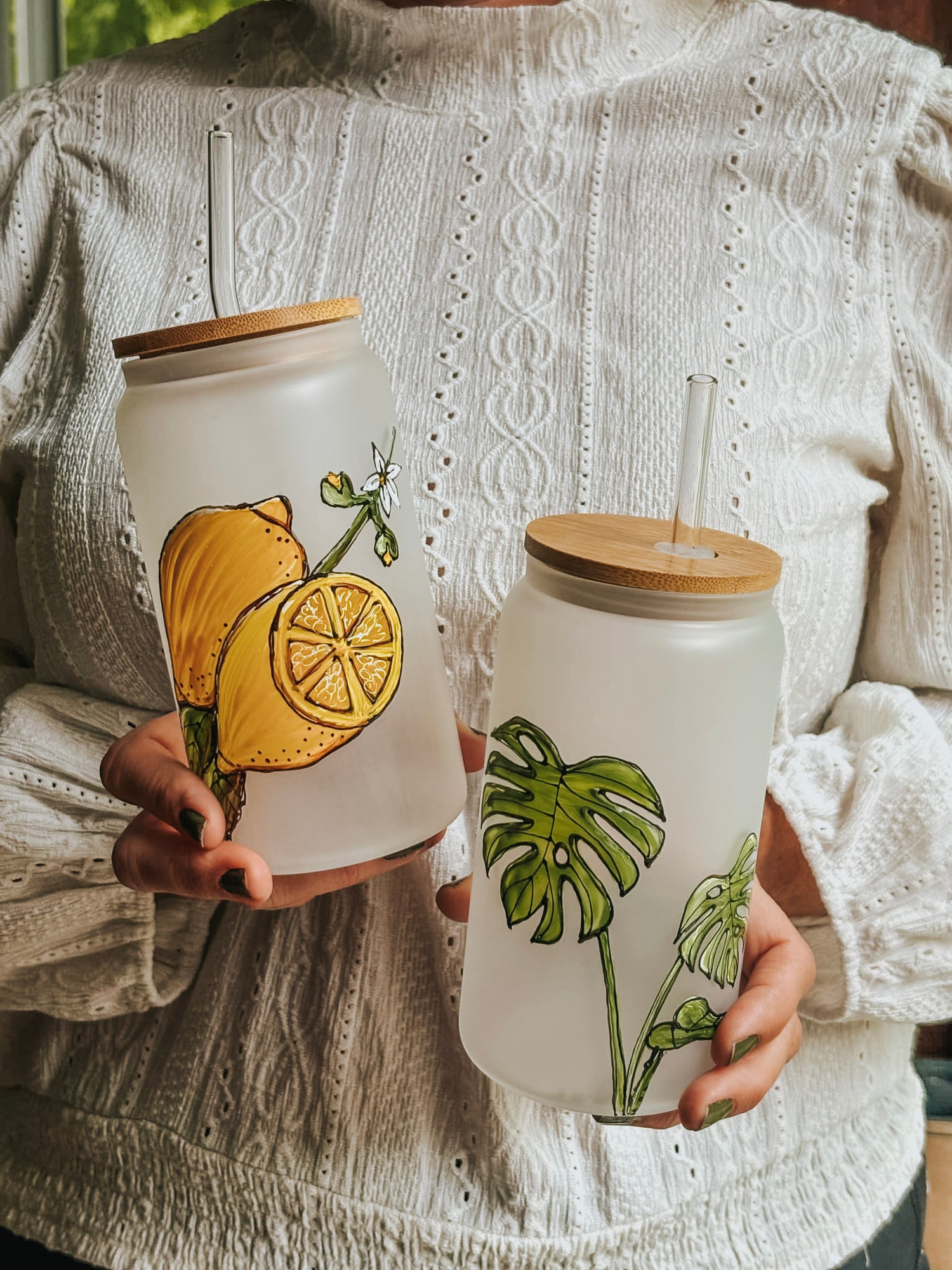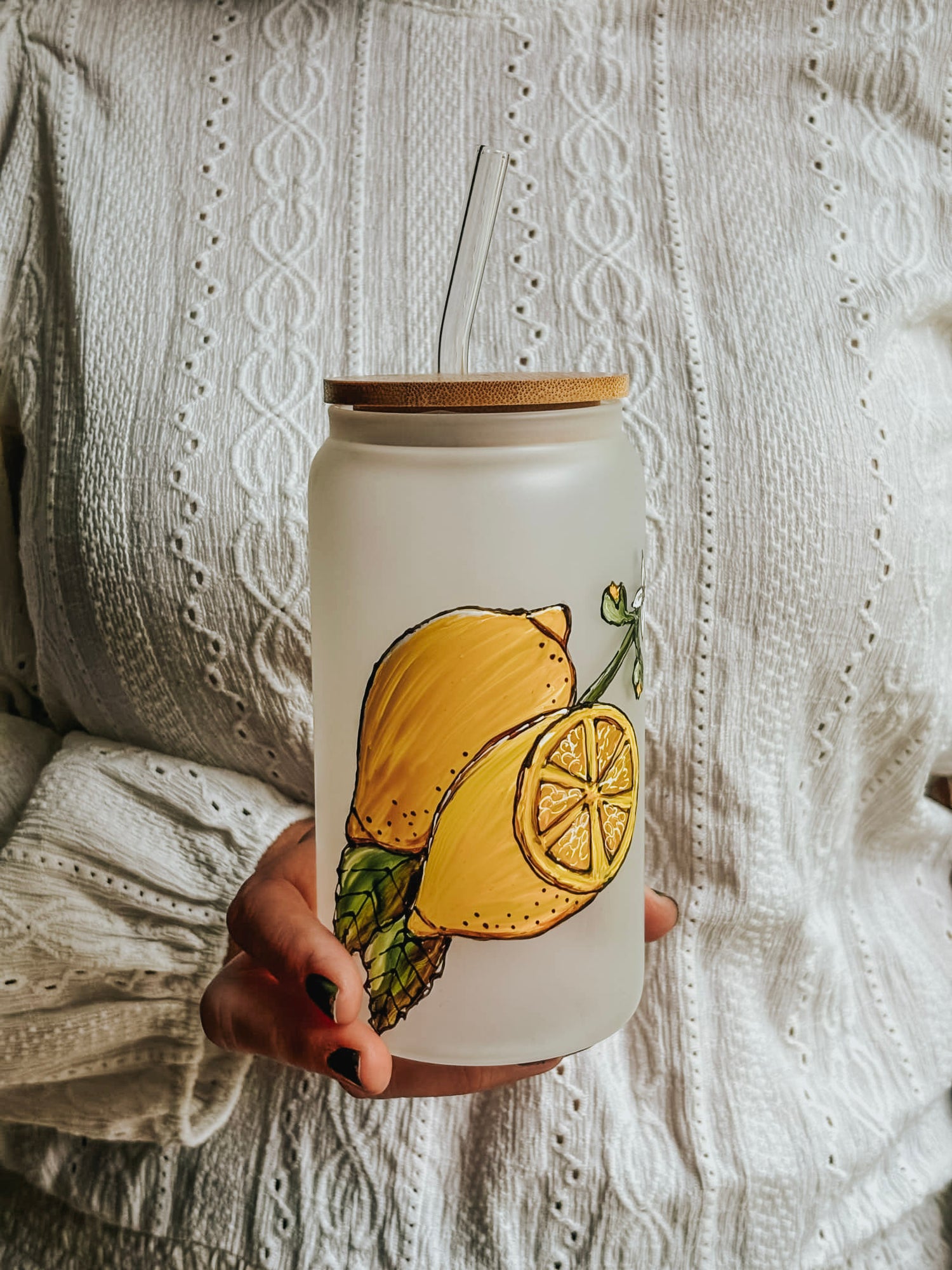 Obtenez ce verre givré de format canette au design de citrons peints à la main.