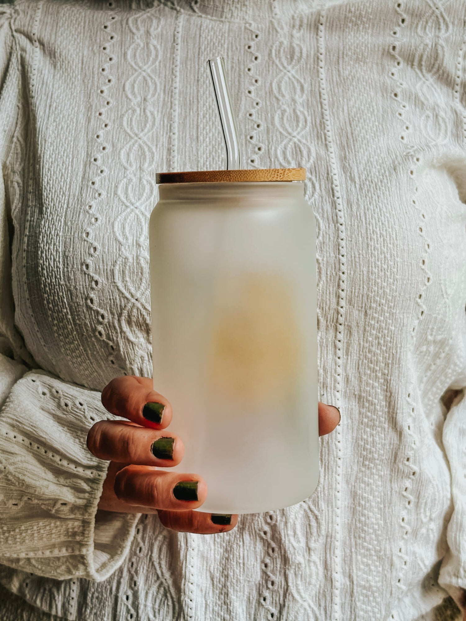Le verre vient avec un couvercle en bamboo et une paille en verre.