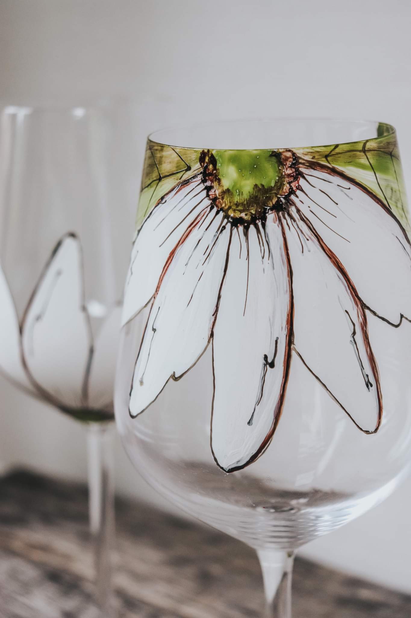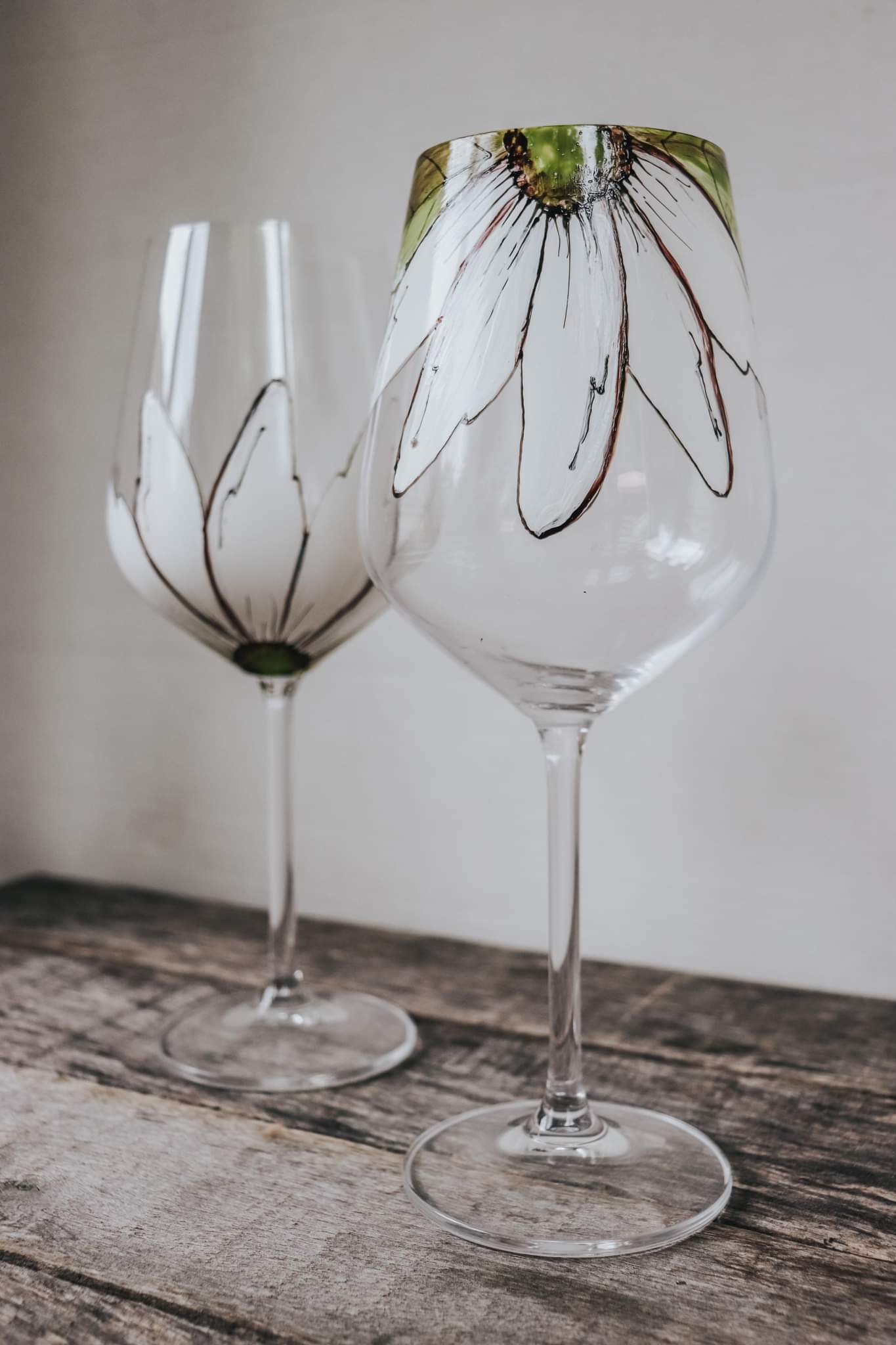 Cet ensemble de verre sur pied est unique et coloré design de fleurs blanches peintes à la main.