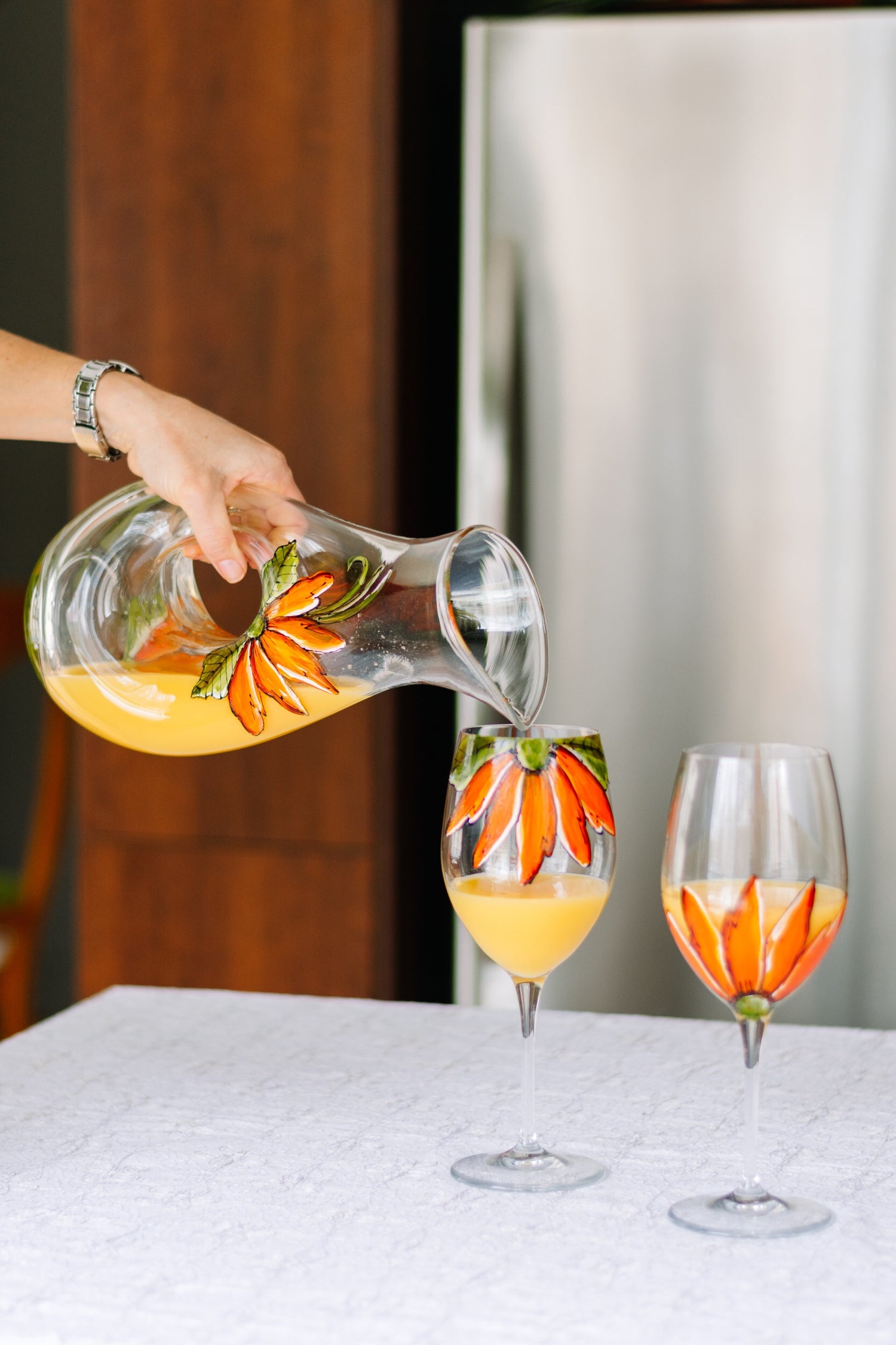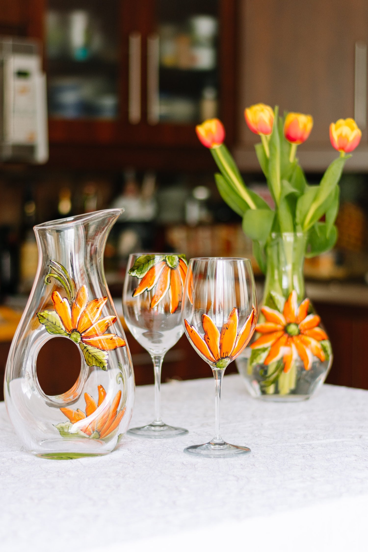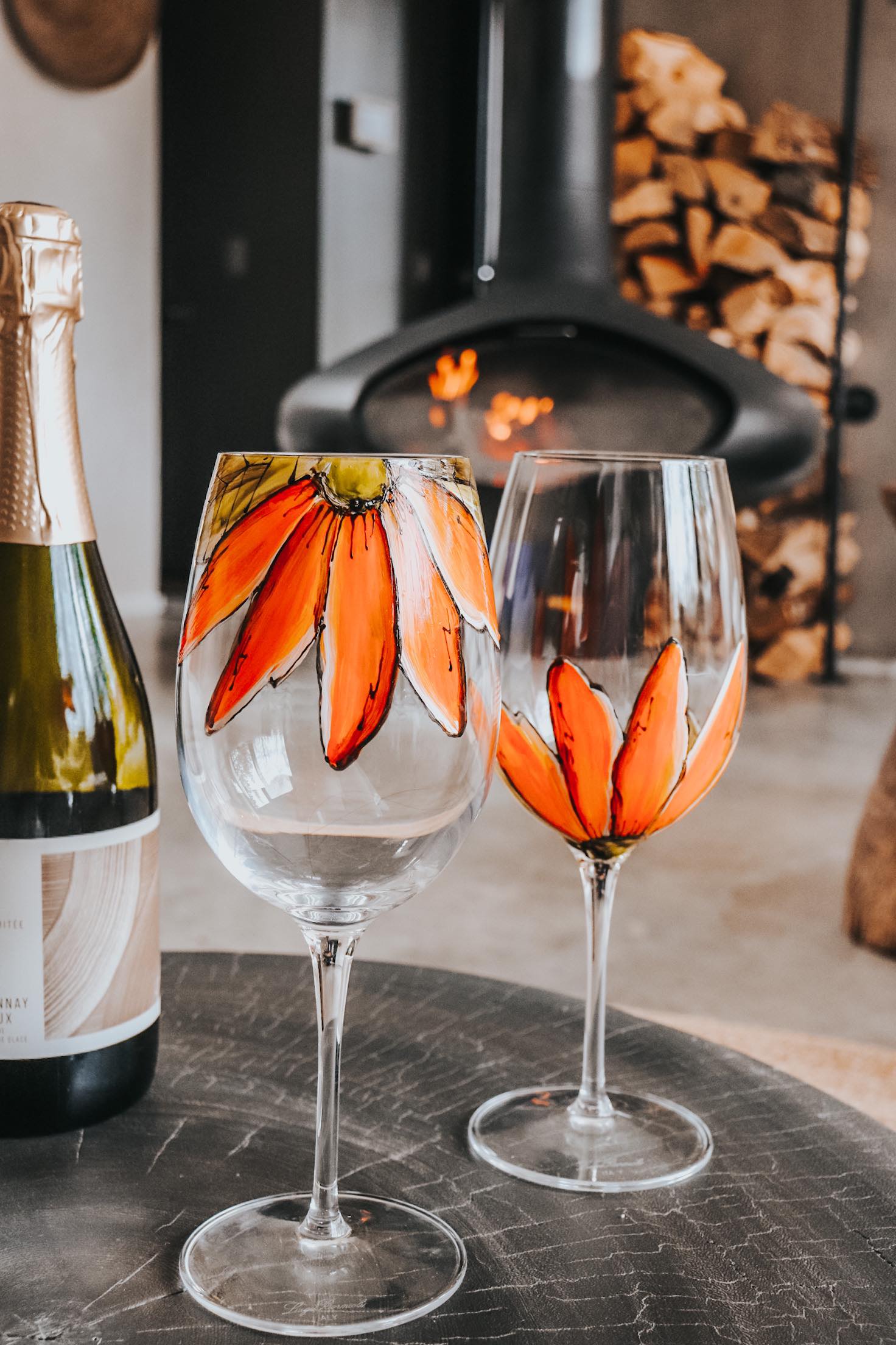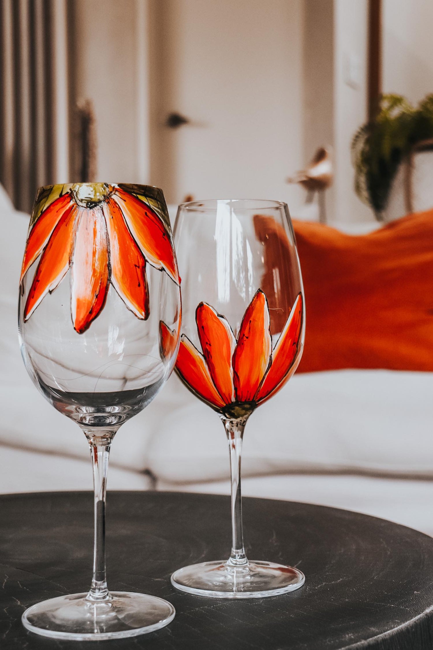 Un dessin de fleur orange coloré est peint à la main, différent sur chacun afin de bien les distinguer! Un dans le bas du verre et l'autre dans le haut. Elle se complète à merveille.