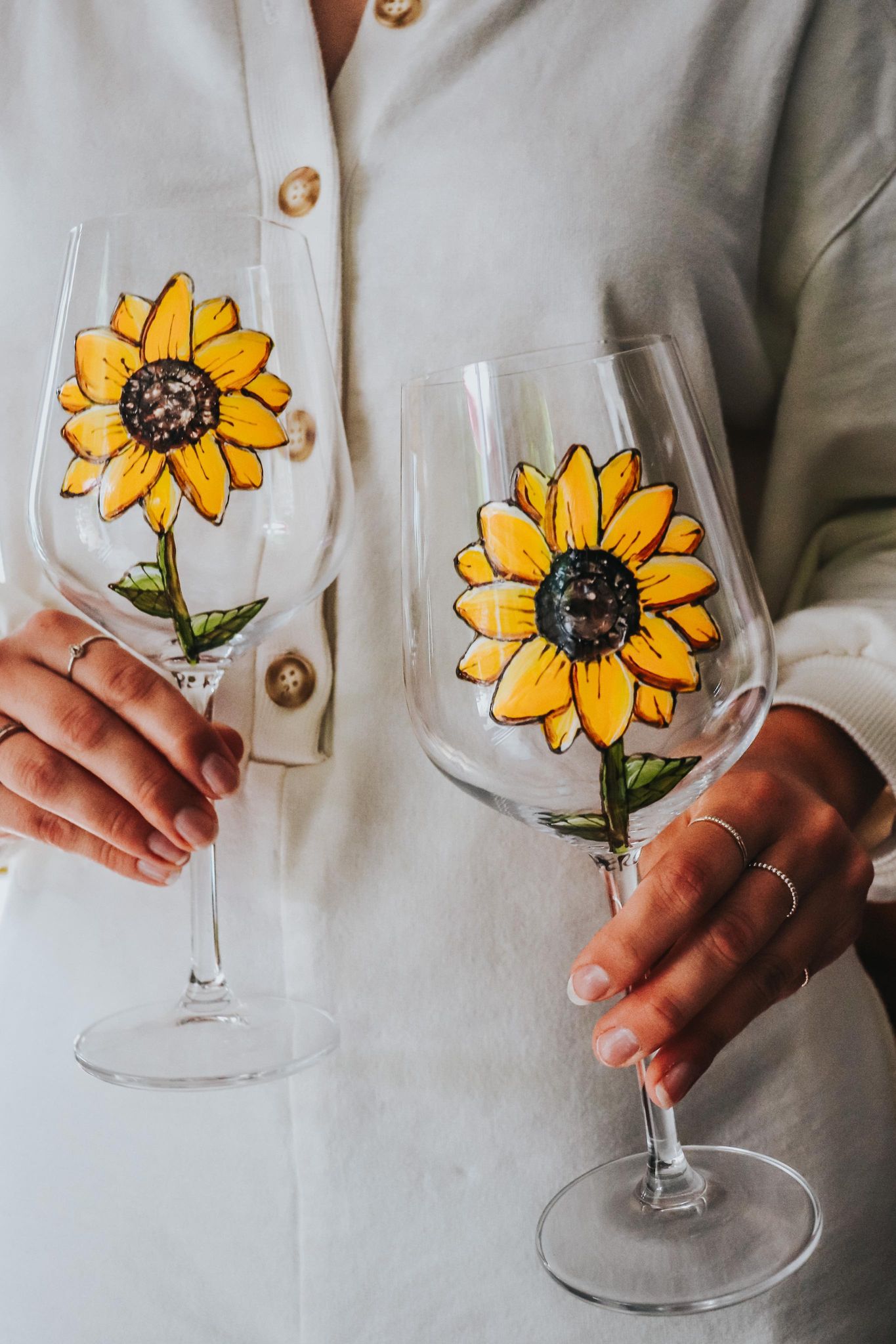 Découvrez cet ensemble de verre unique et coloré, design de 2 fleurs tournesols peintes à la main par Pero.