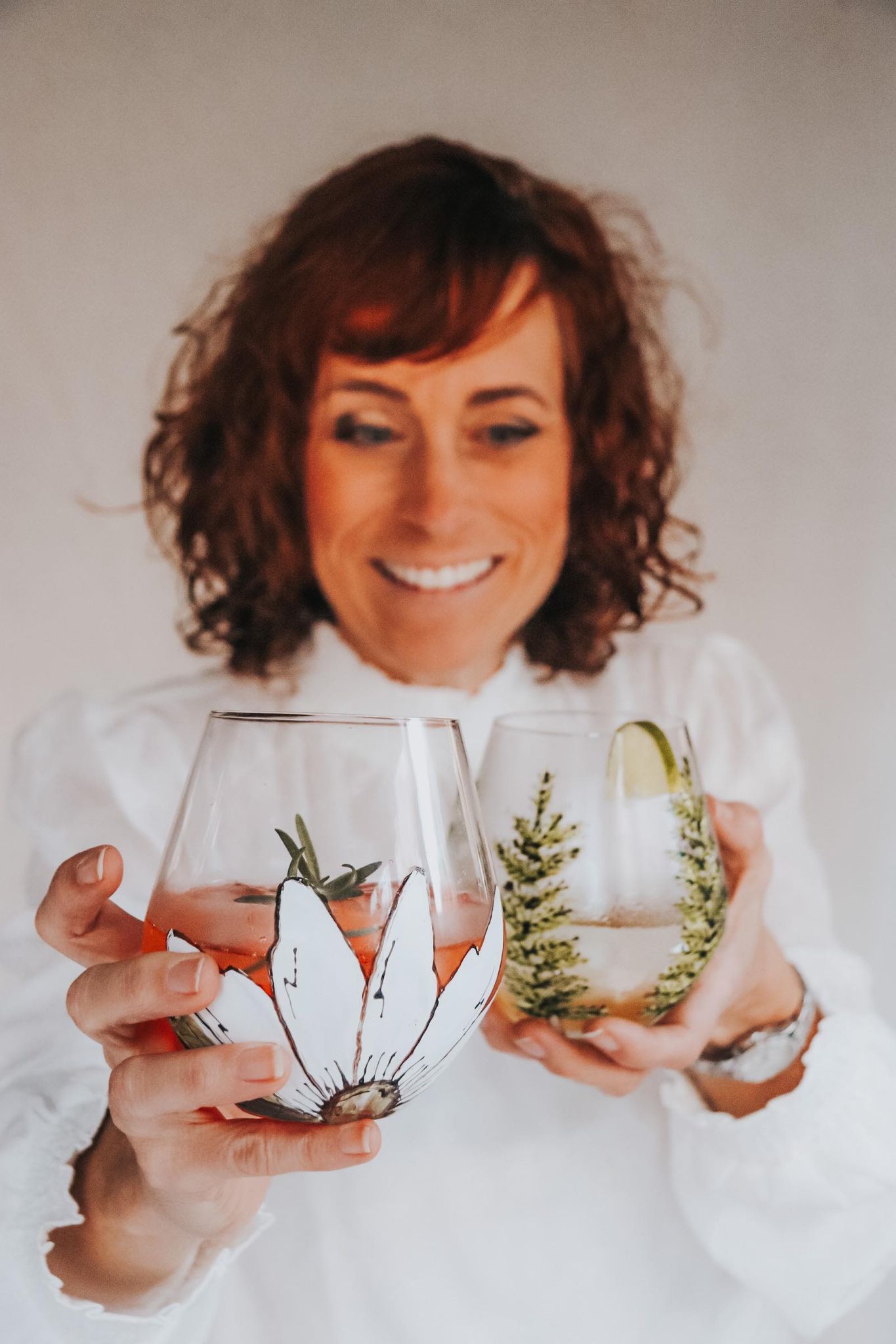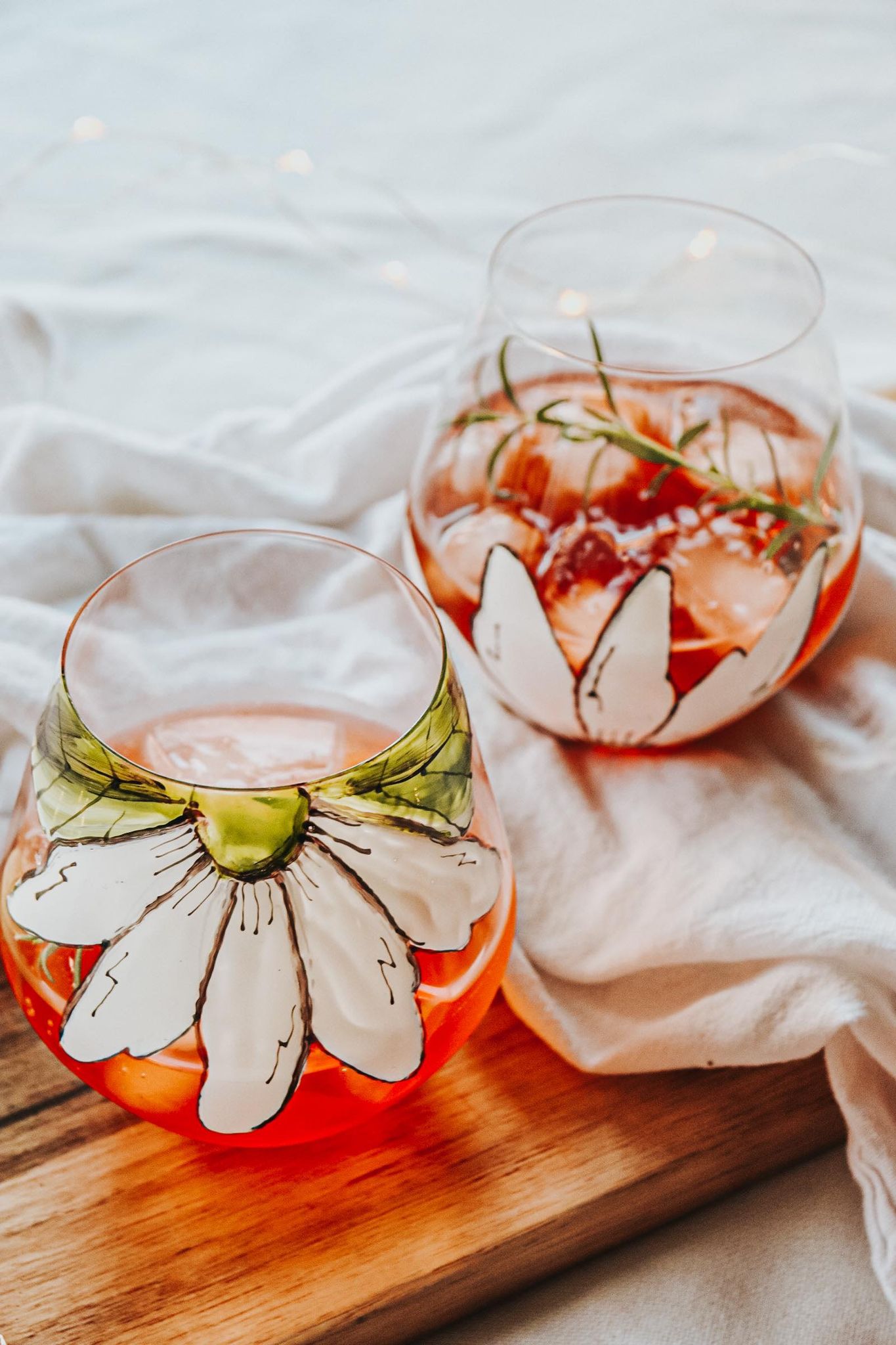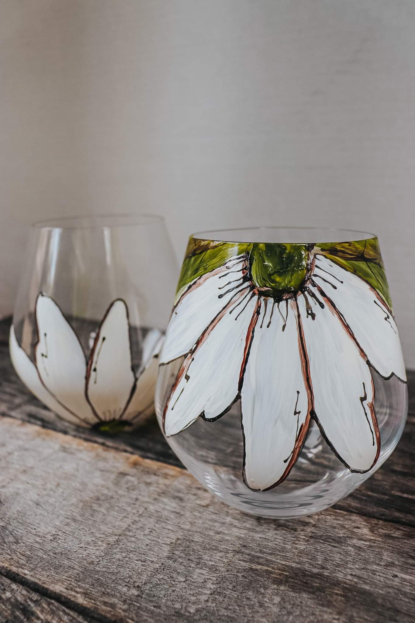 Cet ensemble de verre sans pied est unique et coloré design de 2 demi-fleurs blanches!