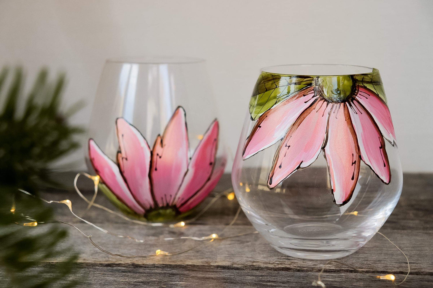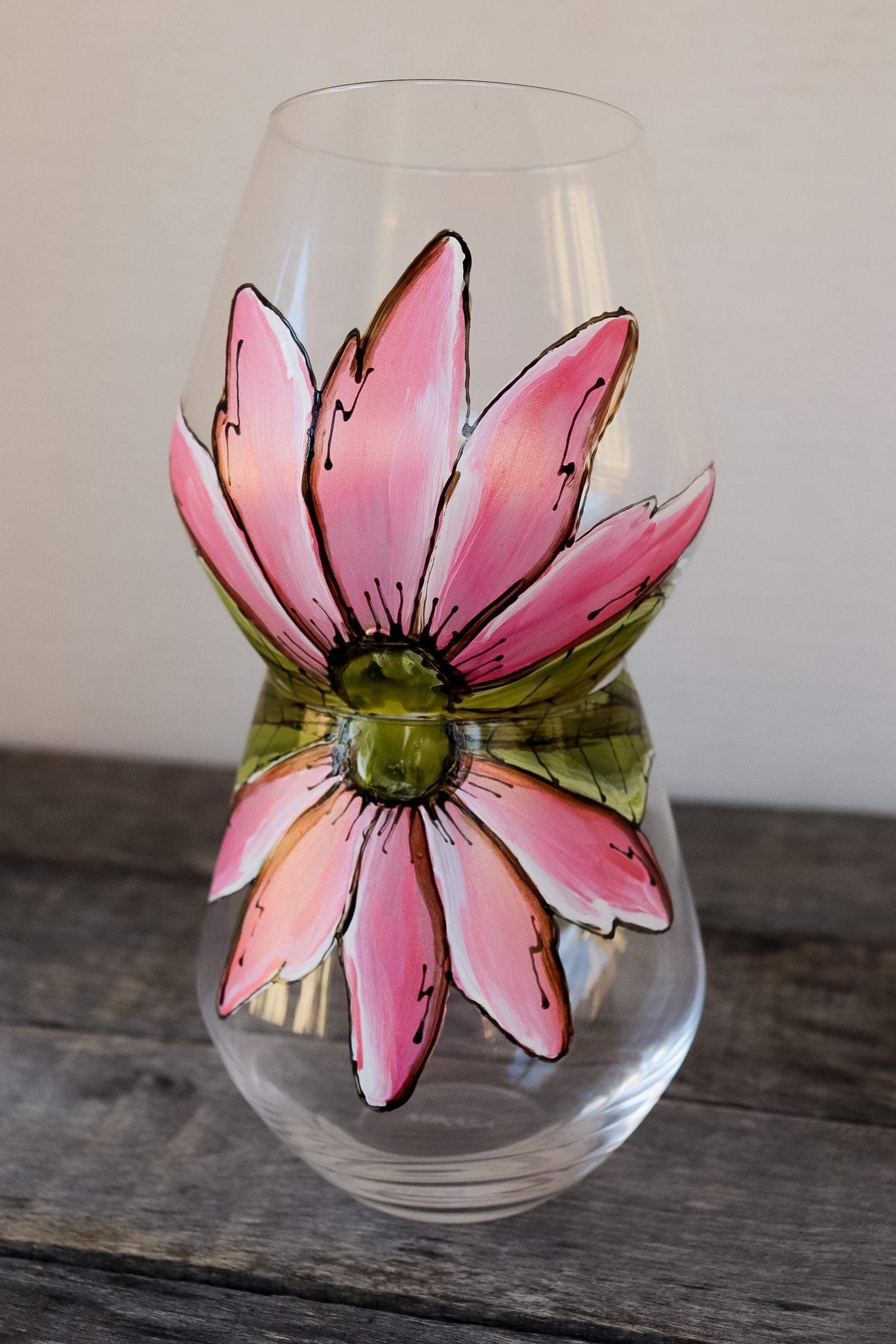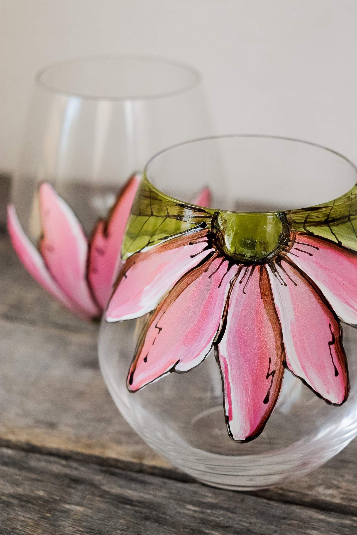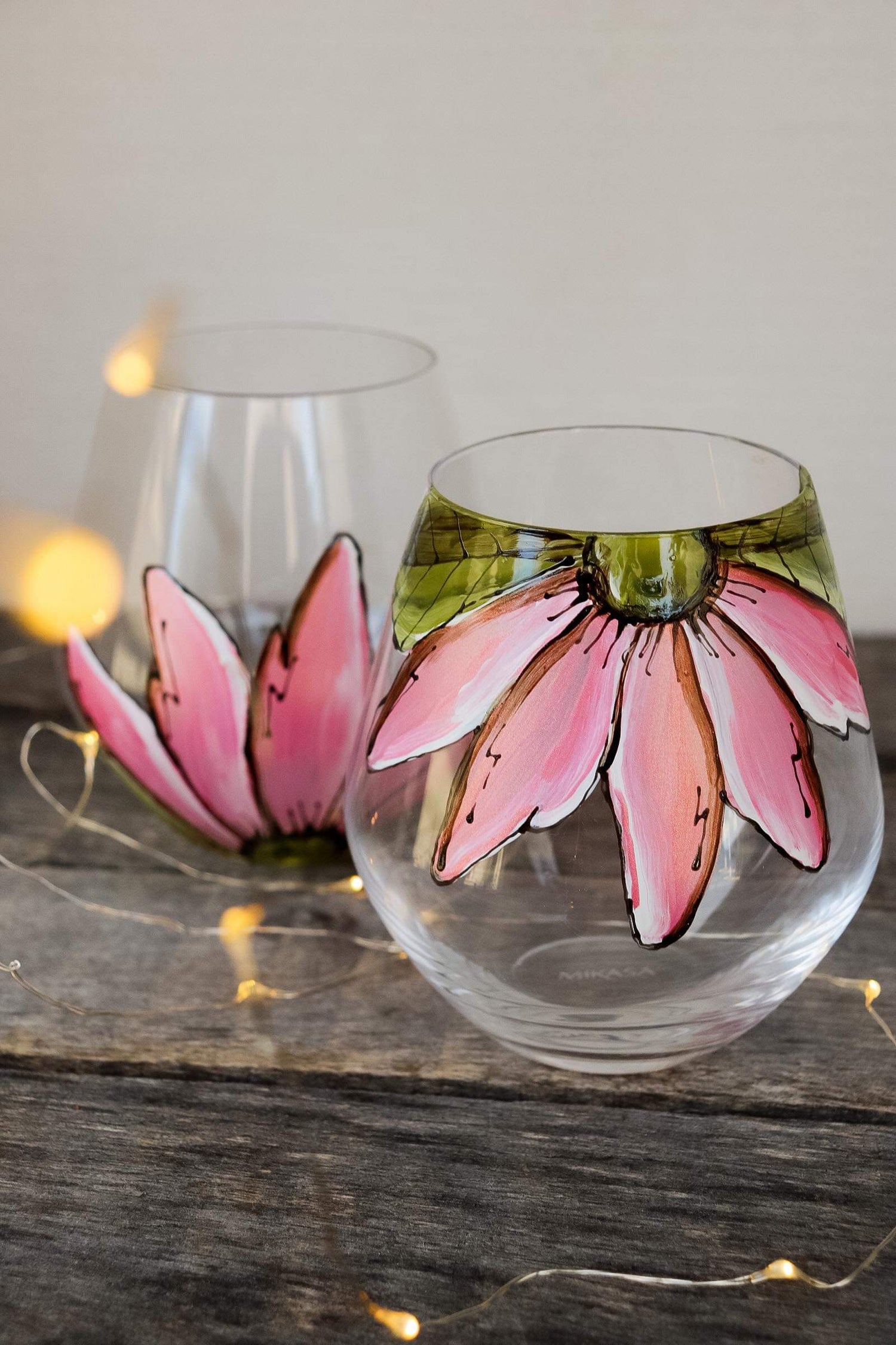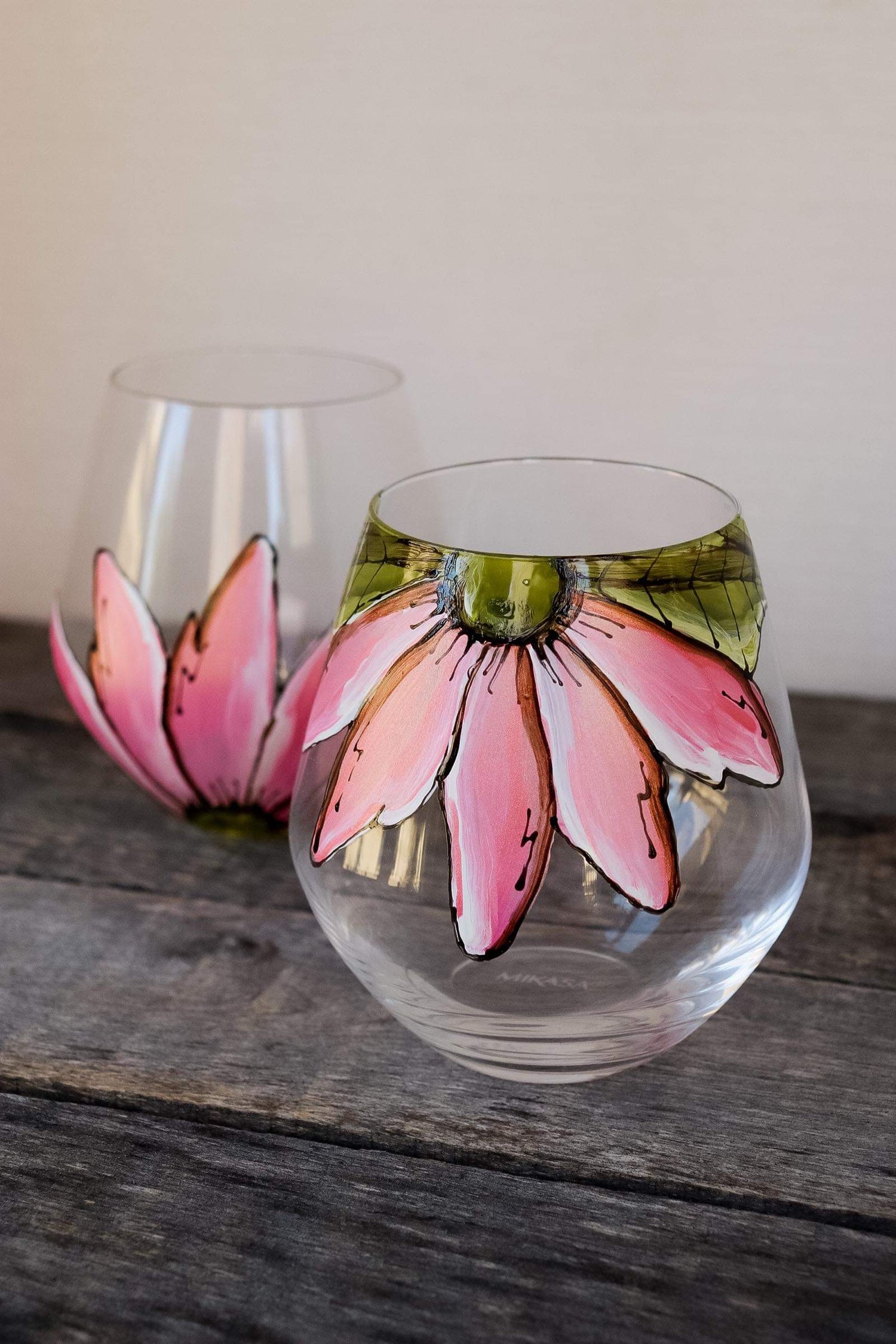 Cet ensemble de verre sans pied est unique et coloré design de 2 demi-fleurs rose moirée!
