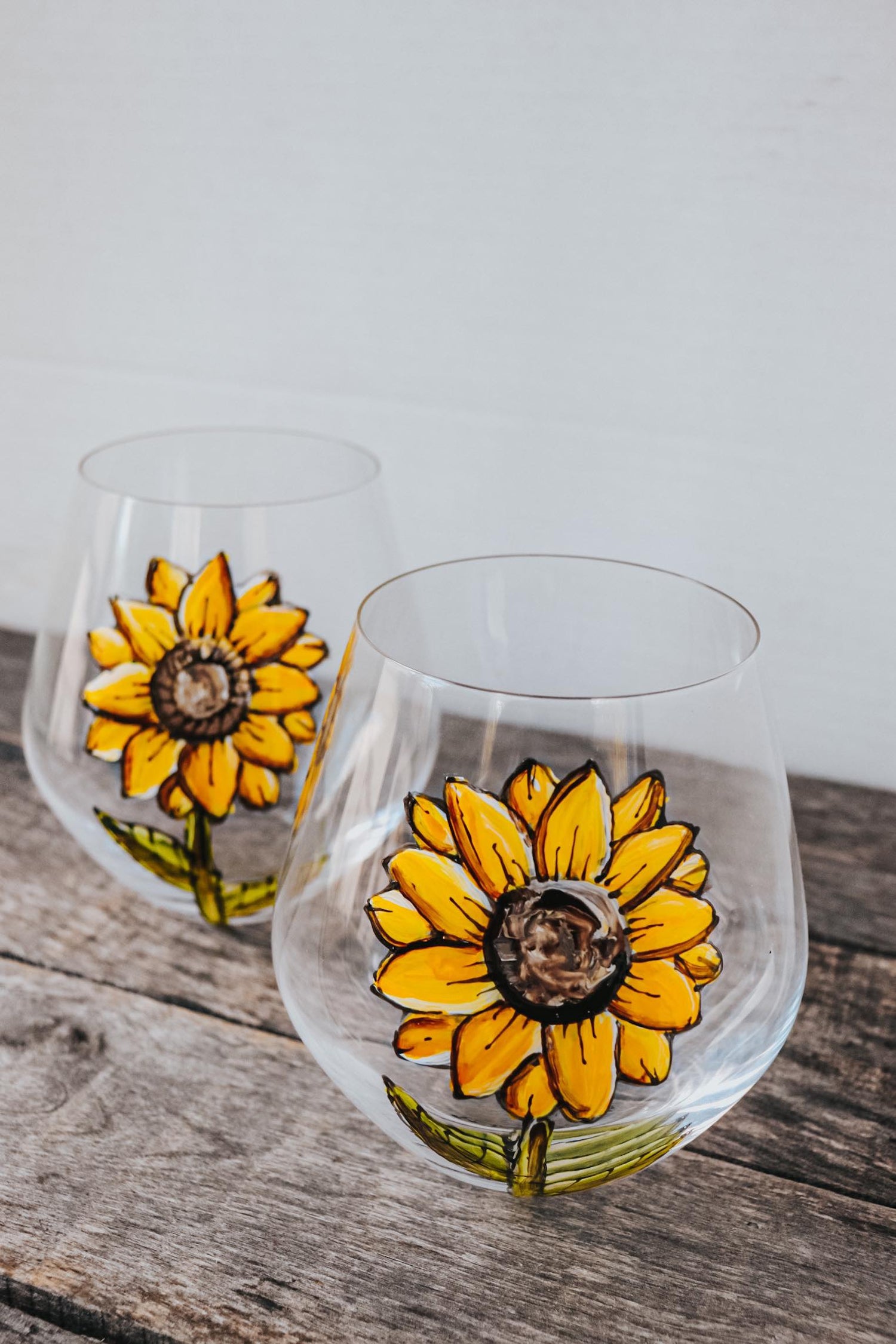 Cet ensemble de verre sans pied est unique et coloré, design de 2 fleurs tournesols.