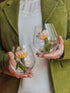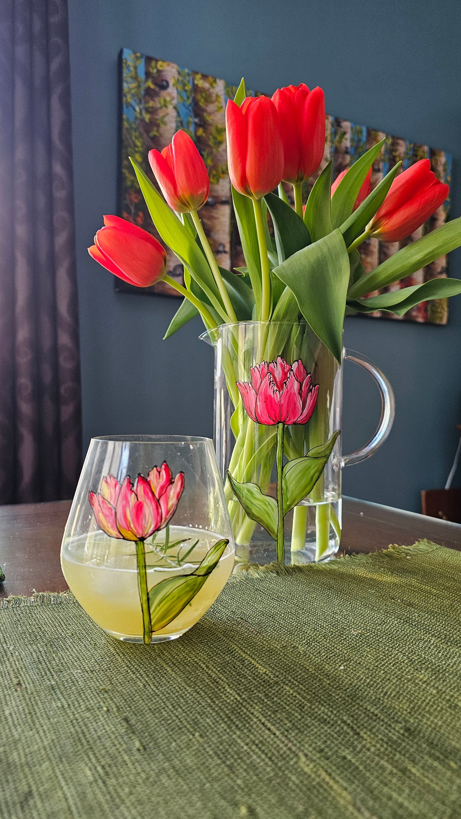 Obtenez ce duo de verres sans pied au design de tulipe aux couleurs mixées de jaune, blanche et rouge, à la fois original et coloré.