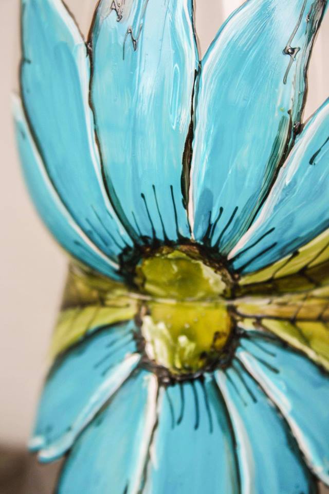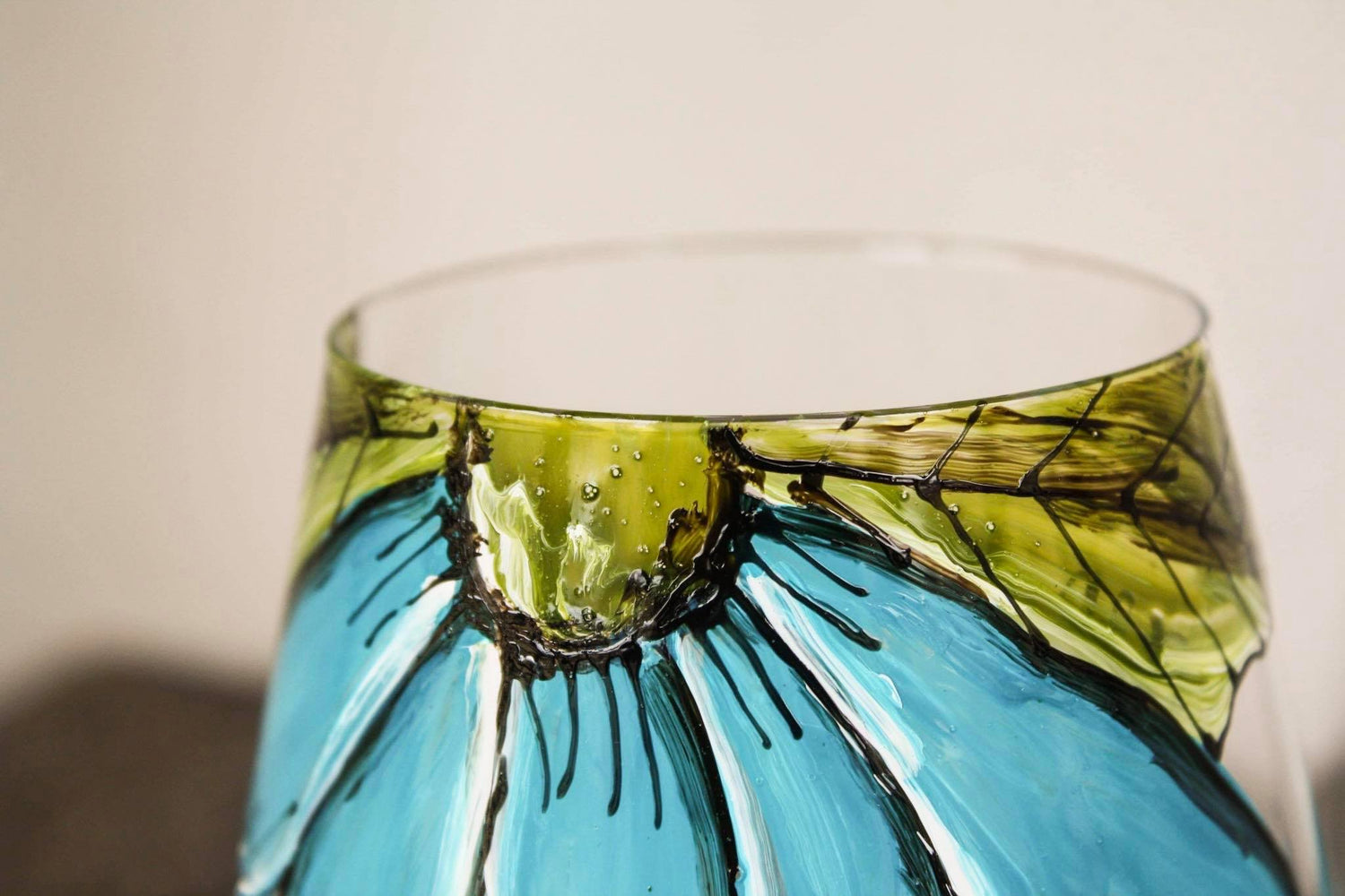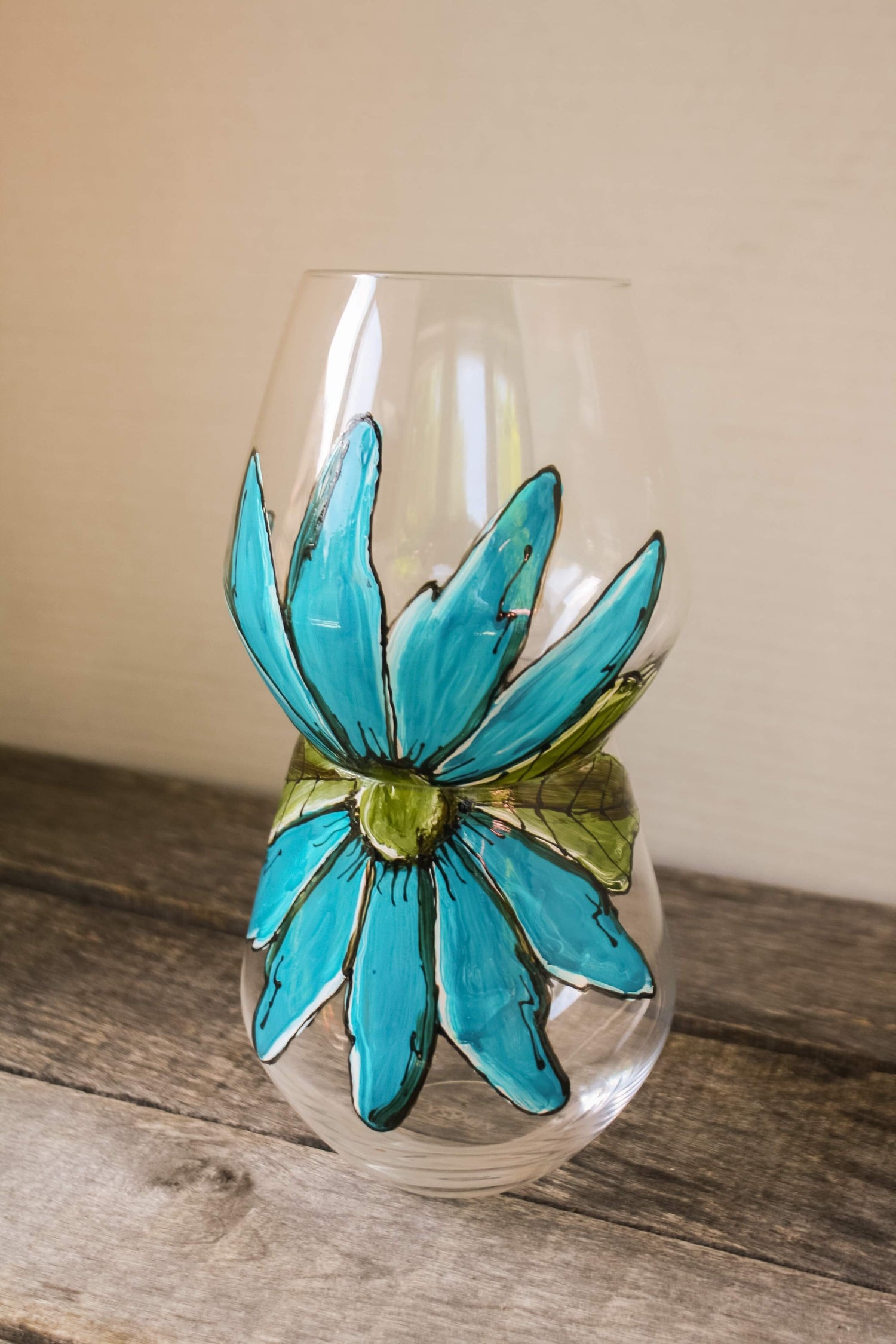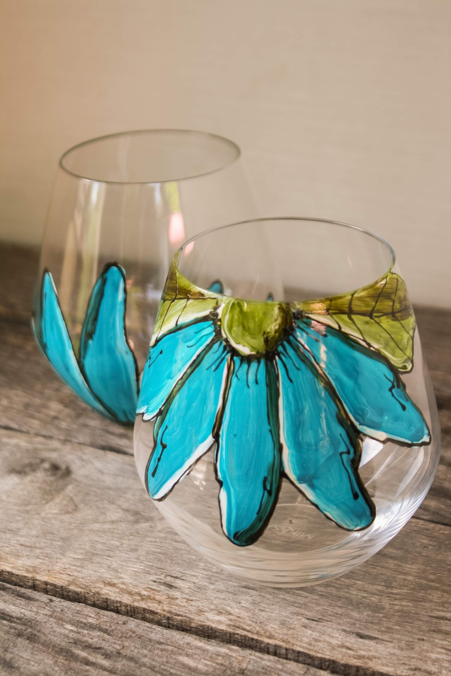 Cet ensemble de verre sans pied est unique et coloré design de 2 demi fleurs turquoises!