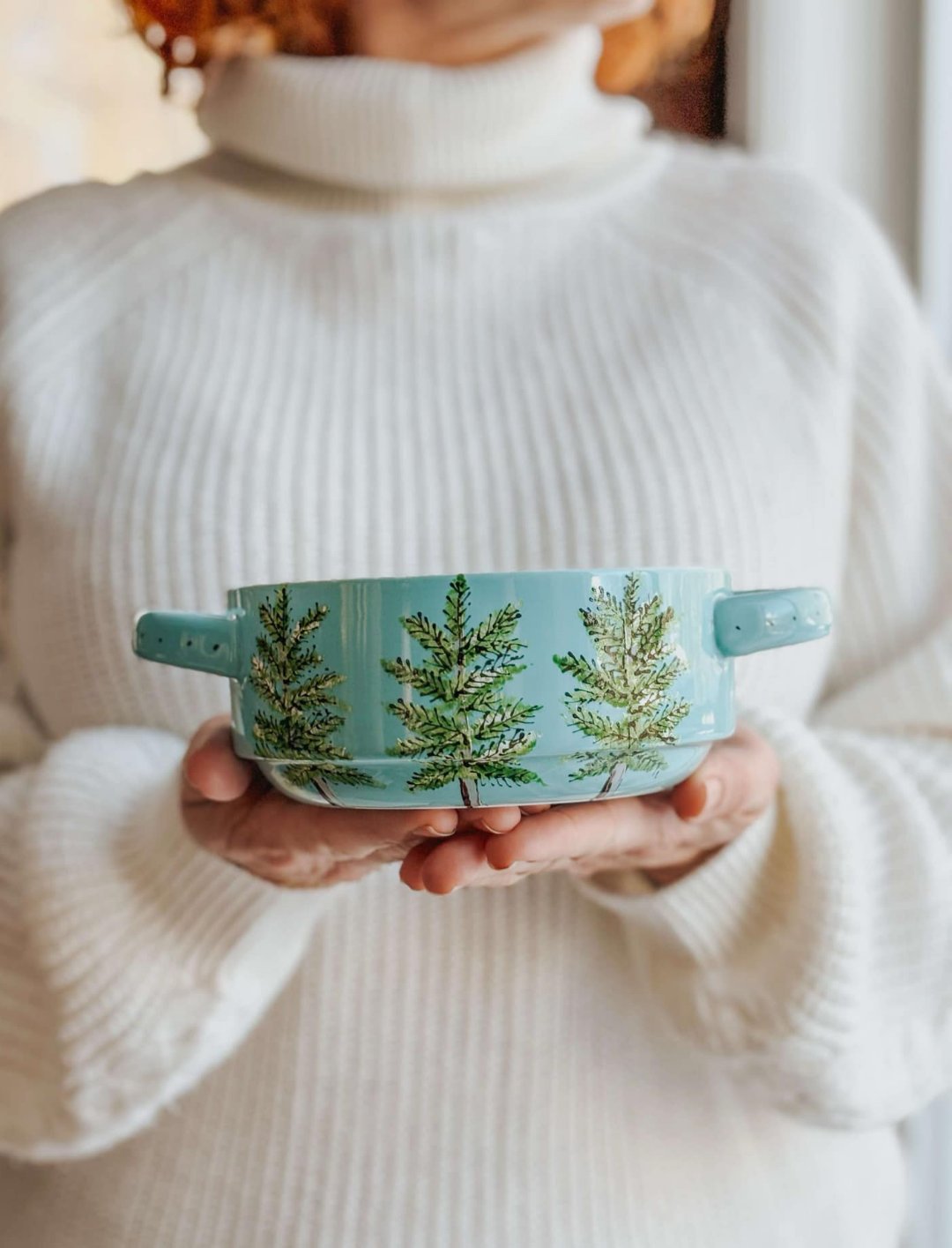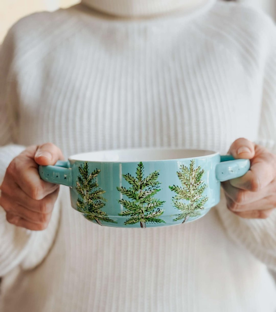 Bol turquoise lustré avec 2 anses, design Boréale rustique peint à la main par Pero