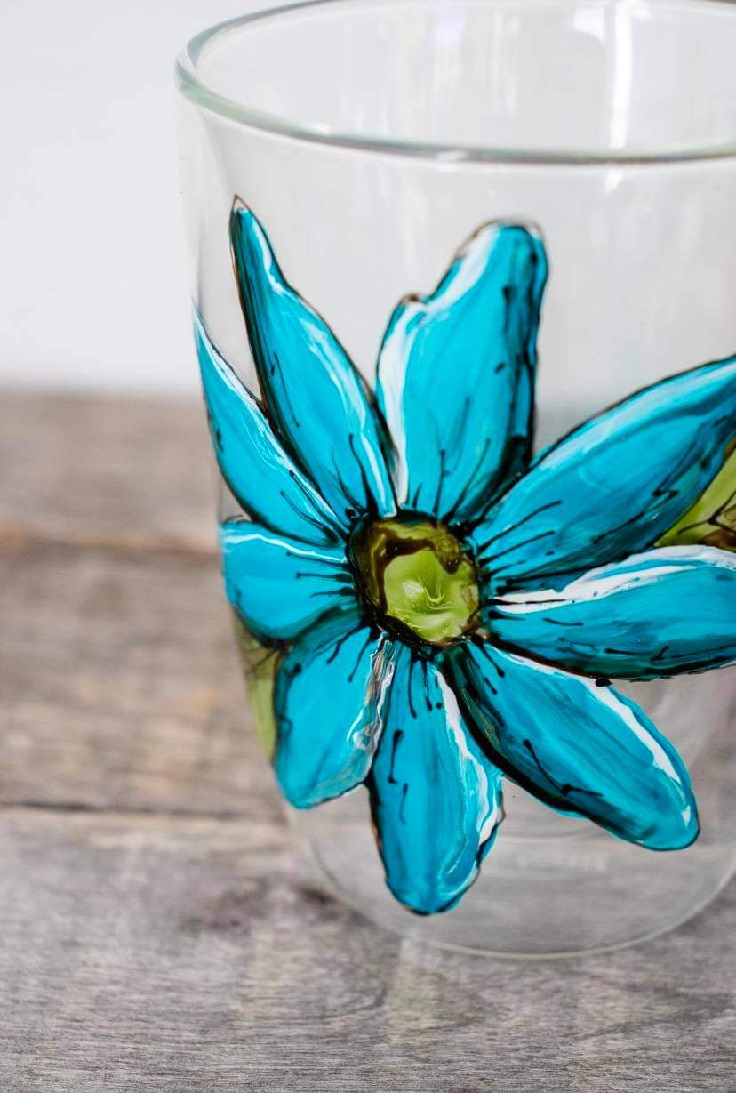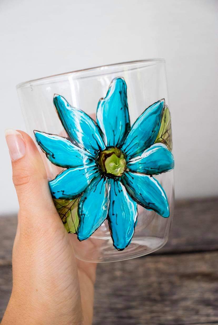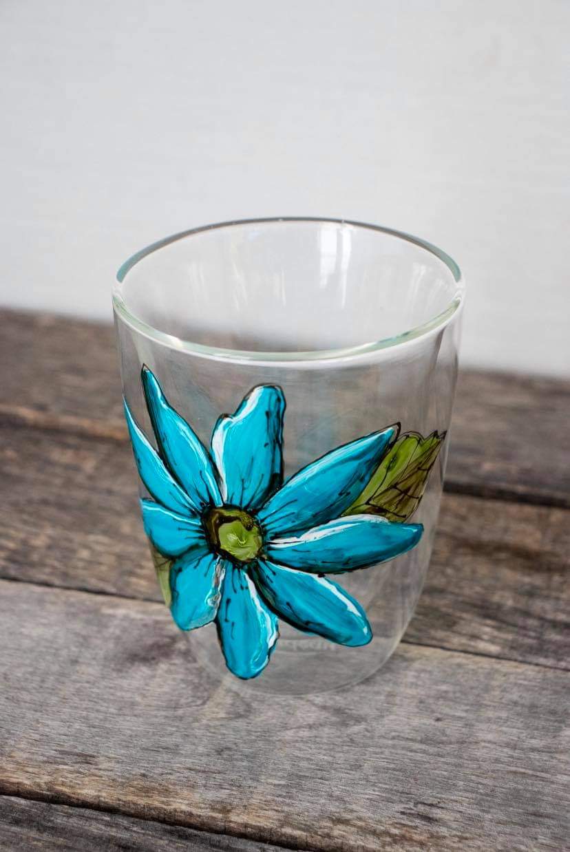 Ce verre double paroi gardera votre liquide chaud plus longtemps et est sans condensation. Il est peint à la main avec une belle fleur turquoise.